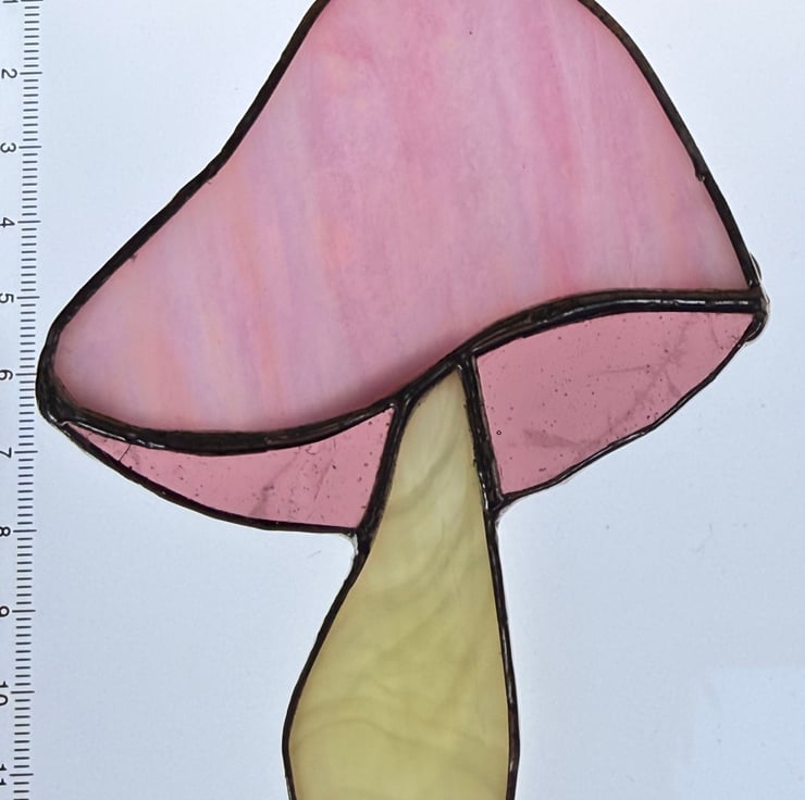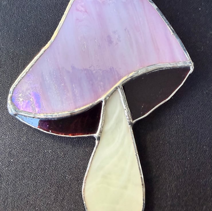 Each mushroom is hand cut and crafted using the Tiffany foiled glass method. Every piece of glass is edged with copper foil, soldered, and cleaned. Craft glass naturally contains small variations and tiny imperfections, making every mushroom a unique original. The photographs show the colours as faithfully as possible, though stained glass always shifts a little with the changing light.