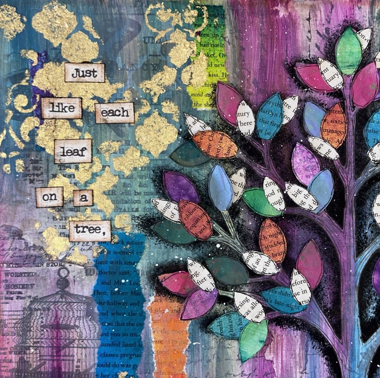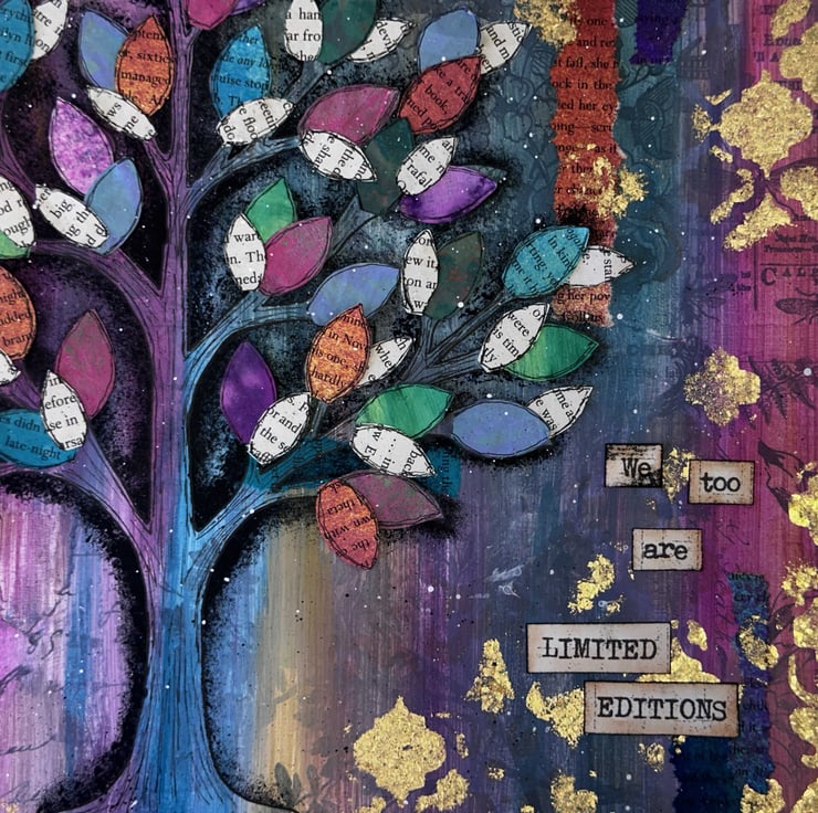 A celebration of uniqueness. At the heart of the artwork is the sentiment "just like each leaf on a tree, we are all limited editions". each word has been individually stamped, cut and layered by hand, giving the message an organic feel.