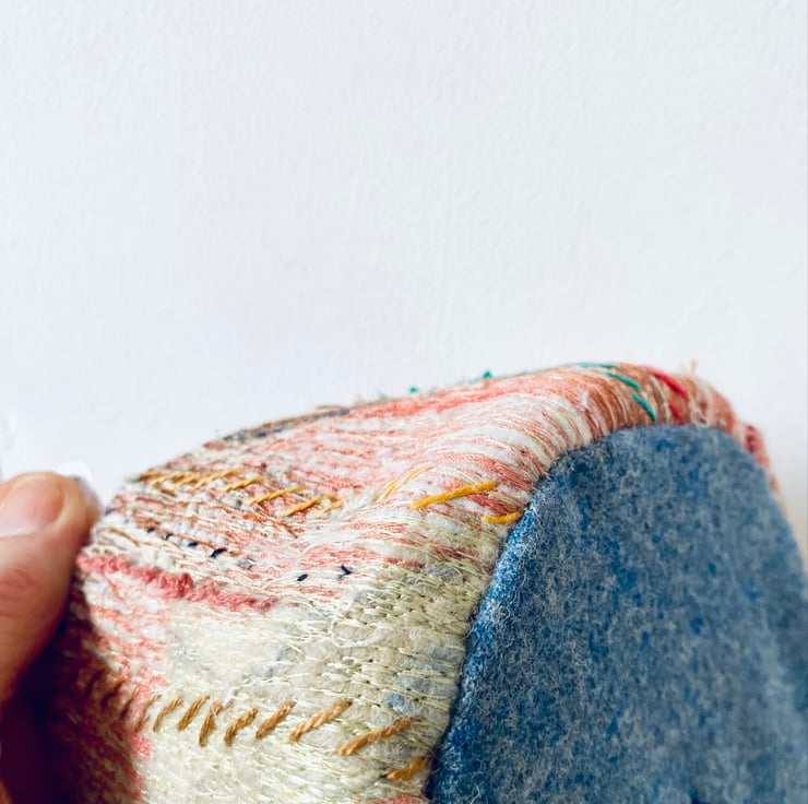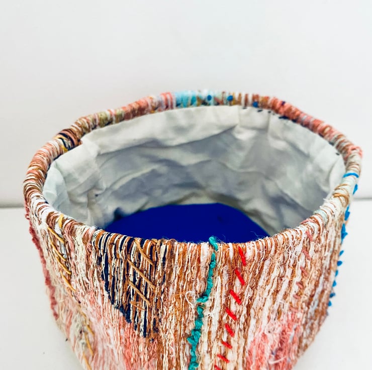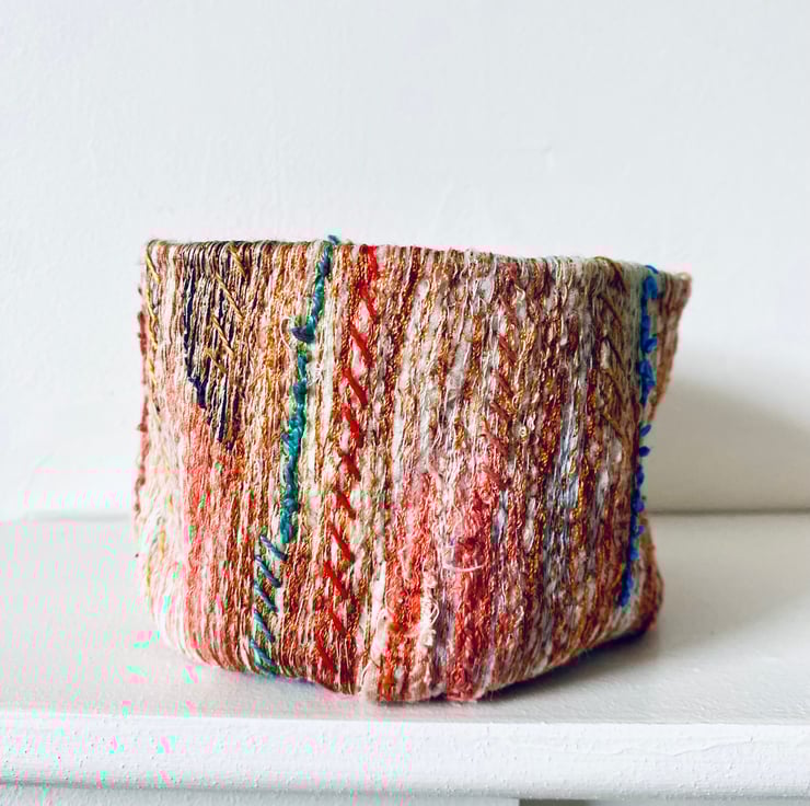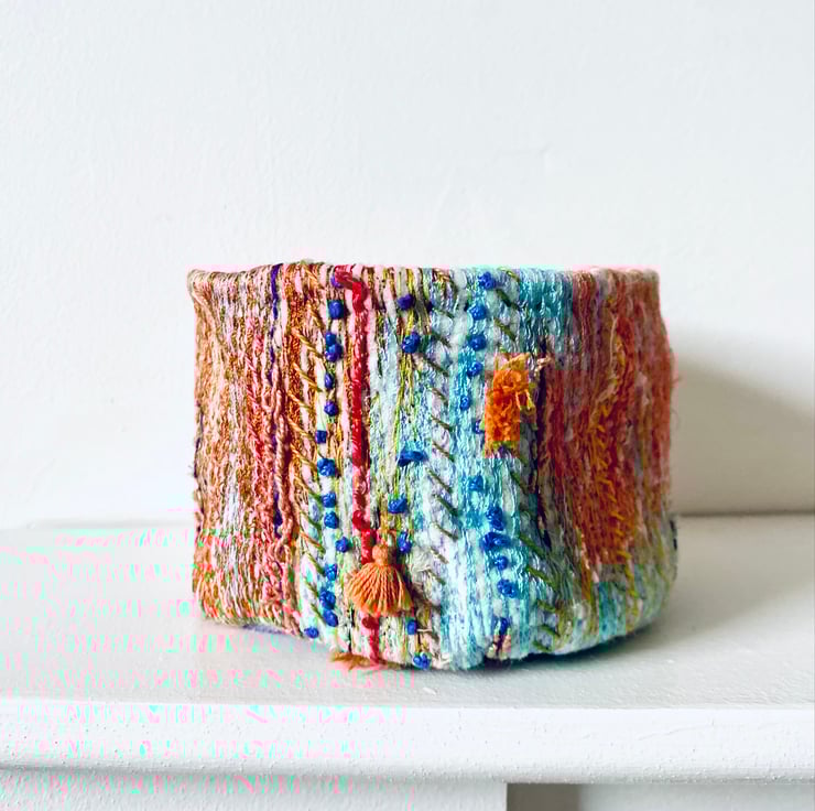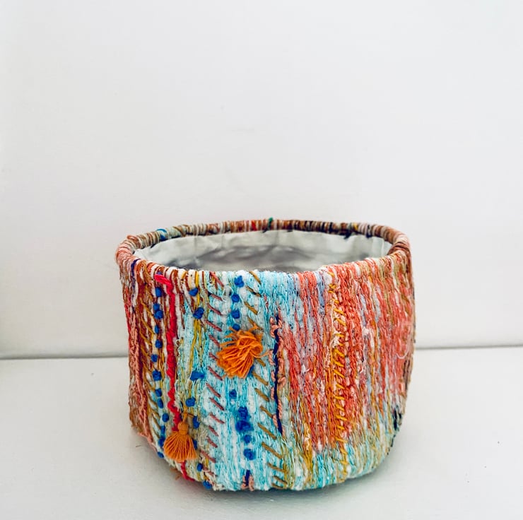 A unique and decorative pot. Made with a mix of preloved fabrics, this colourful textile vessel has been hand and machine embellished.