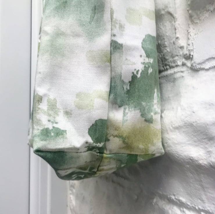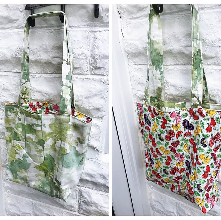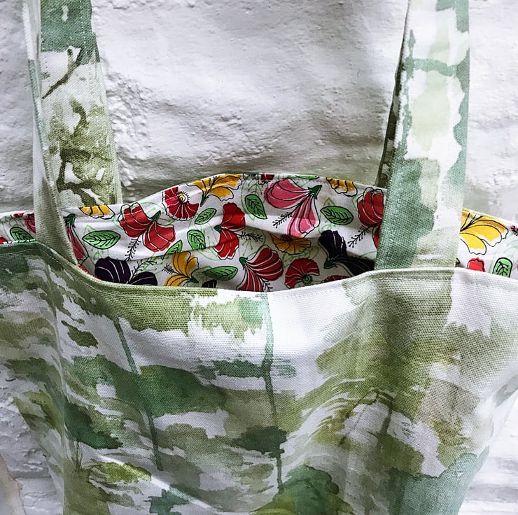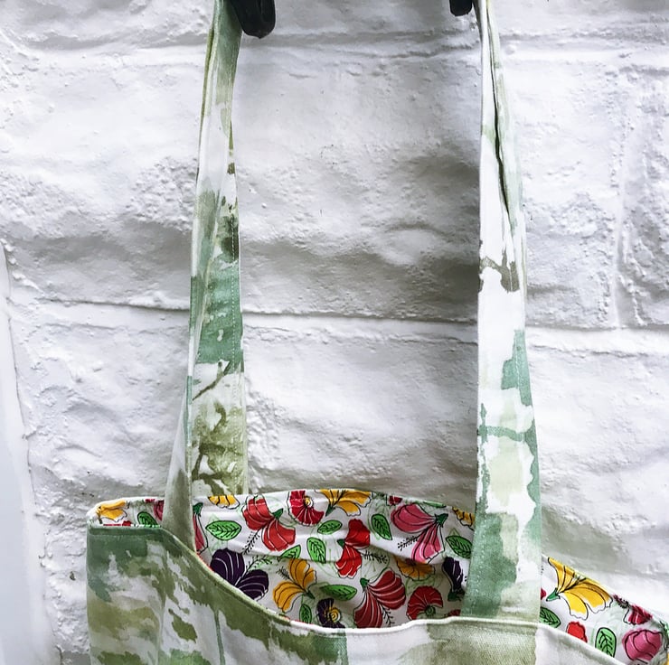 Lined shoulder bag, made from green trees linen fabric. Reversible bag