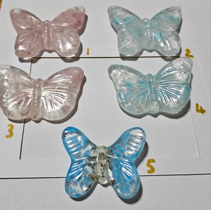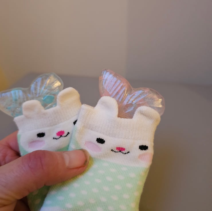 Bring a fresh and original way to your gender reveal. So fresh and also so meaningful . Butterflies symbolise joy, love and a spritual message. So appropriate. The colours are pastel with a subtle pearly glow. They will arrive in a gender neutral (lilac or aqua) bunny sock for a dash of cuteness before the butterfly makes a revealing appearance. They do not lie flat but have a slight angle. Please choose which item you prefer. The price is for 1 item. It then makes a beautiful keepsake which will make a perfect addition to any nursery.