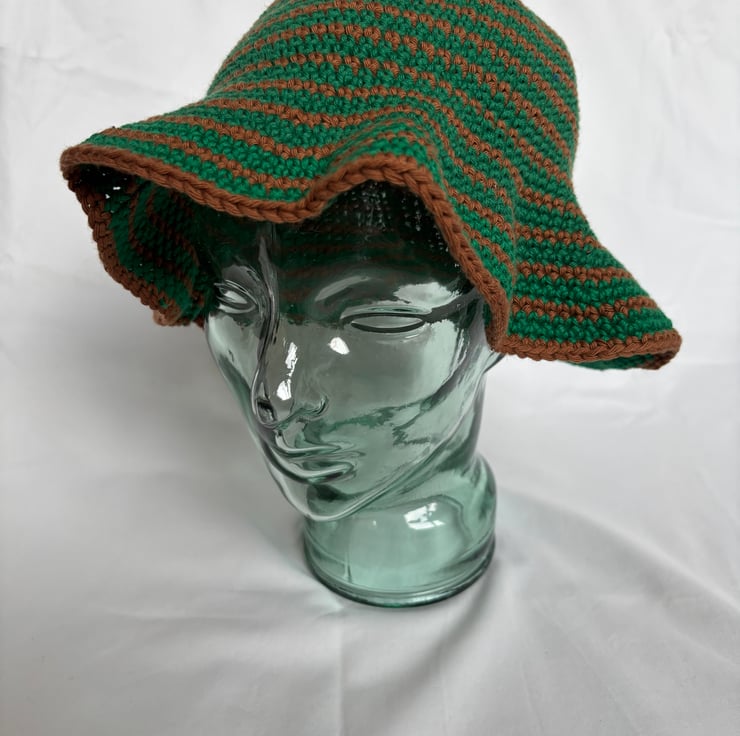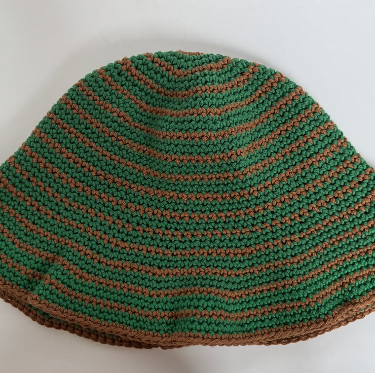 100% cotton crocheted summer hat with floppy rim in emerald and caramel.