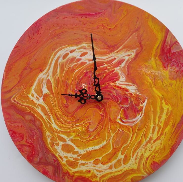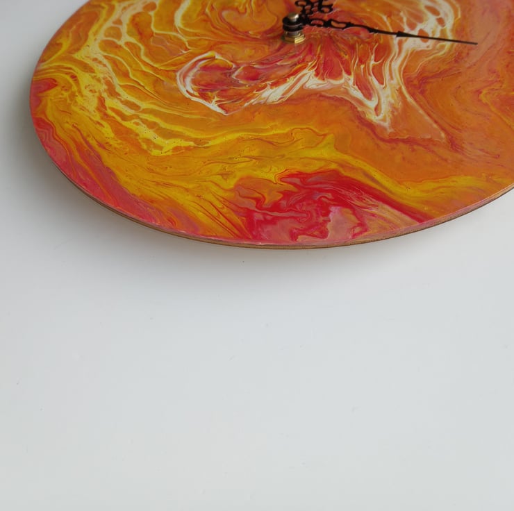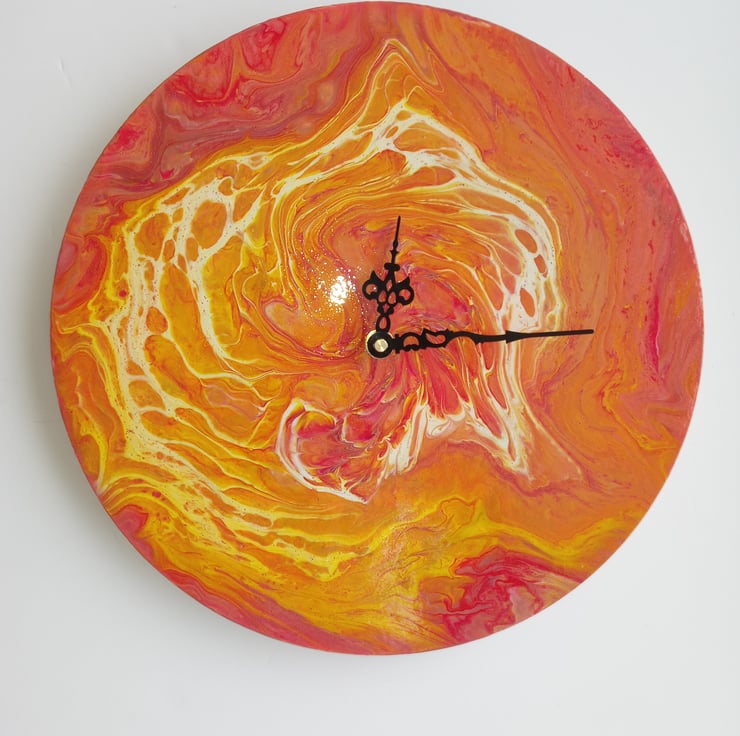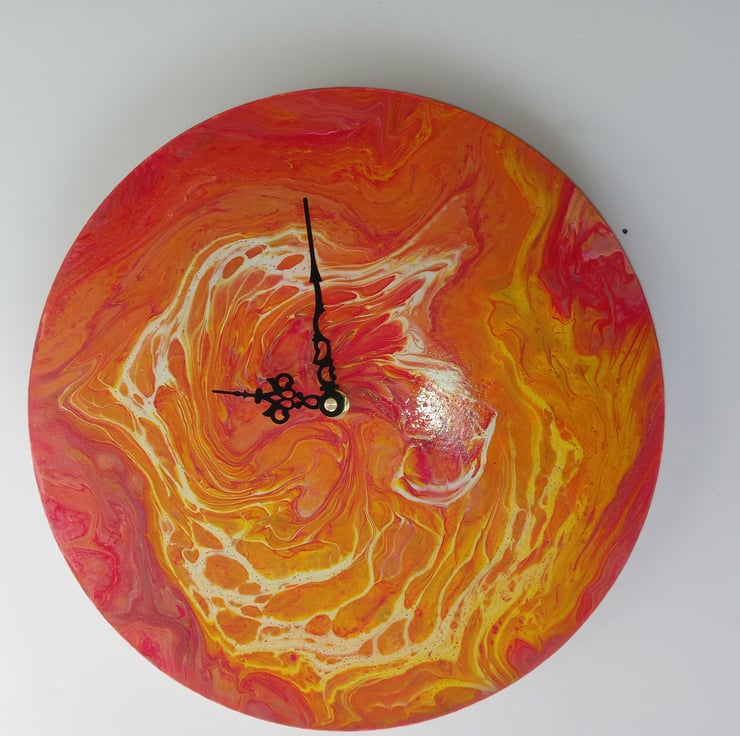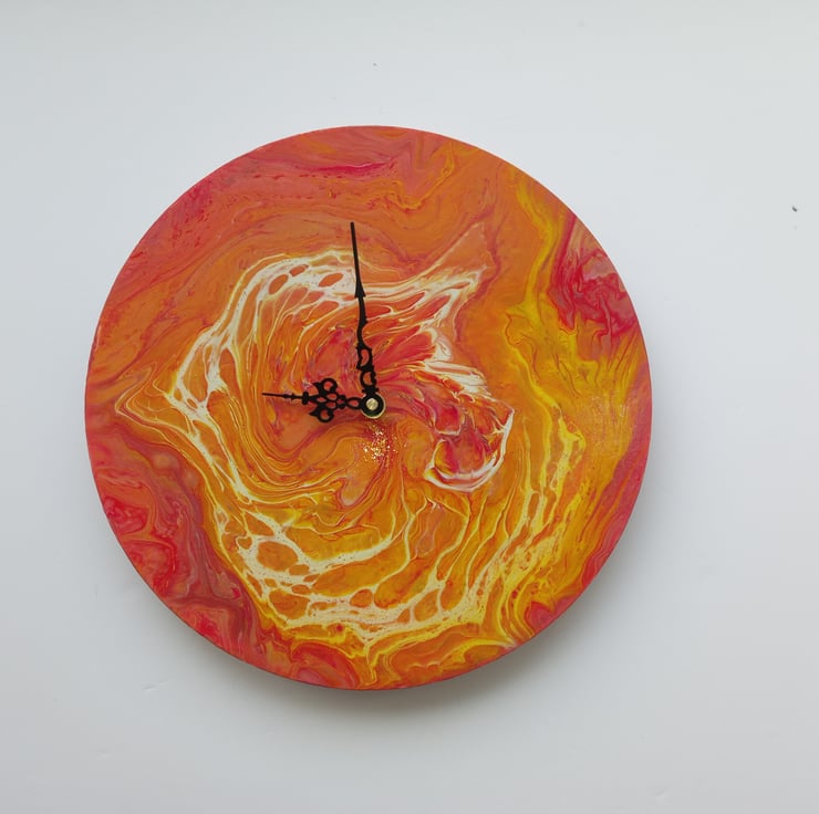 Hand-painted wall clock on a wooden circle.