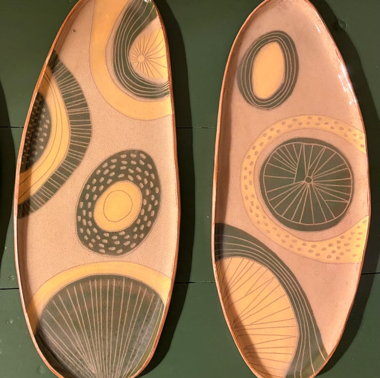 Handmade, one of a kind serving platters. Carved and glazed as unique items. Food safe. 20cm wide and 50cm long