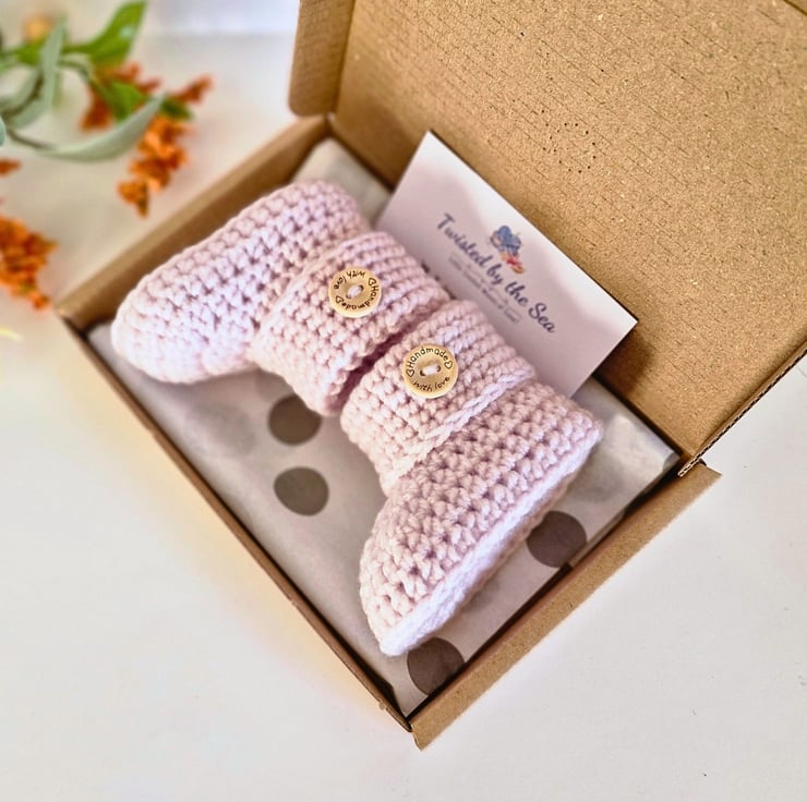 Welcome to Twisted by the Sea – home of beautifully handmade crochet baby gifts including baby booties, hats and cardigans. Each item is thoughtfully crafted using soft Stylecraft Special DK yarn, perfect for new arrivals, baby showers, and keepsake gifts. All made from my coastal home in Lincolnshire.