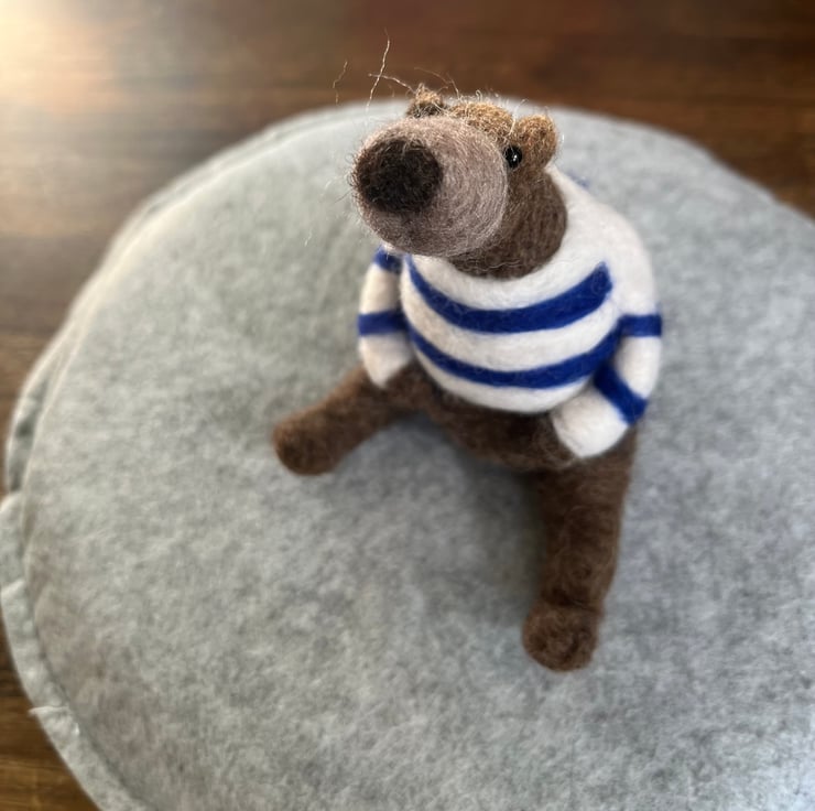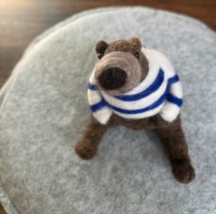 This is a beautiful needle felted brown bear in a striped blue and white top.