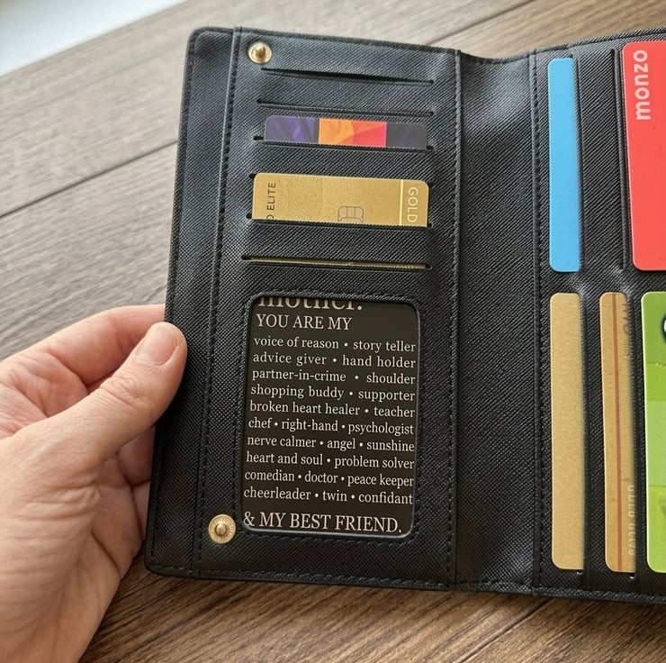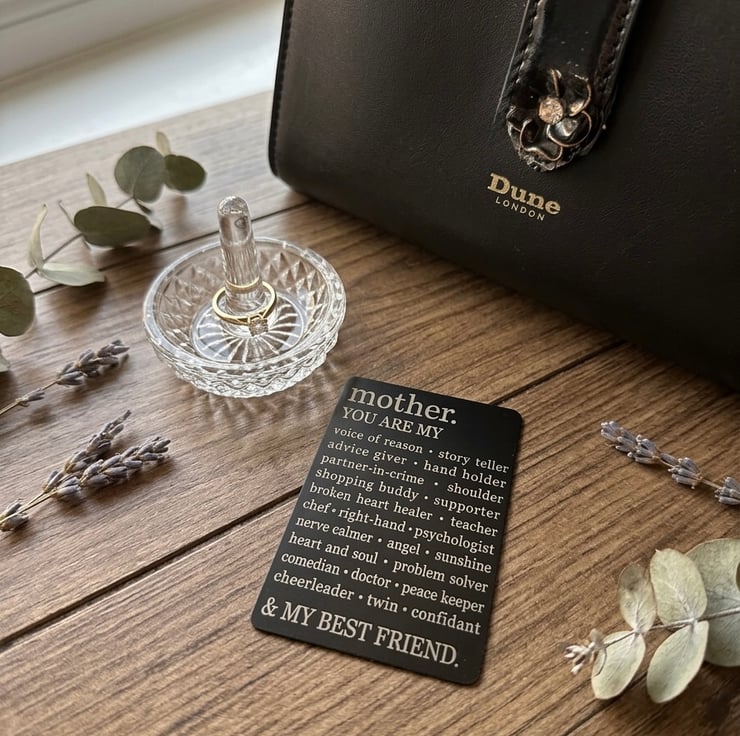 Give your mum a gift that stays with her every day. This sleek, durable wallet insert is beautifully engraved with all the reasons why she’s special. From being the "voice of reason" to her role as a "partner-in-crime," this card captures the many hats a mother wears.