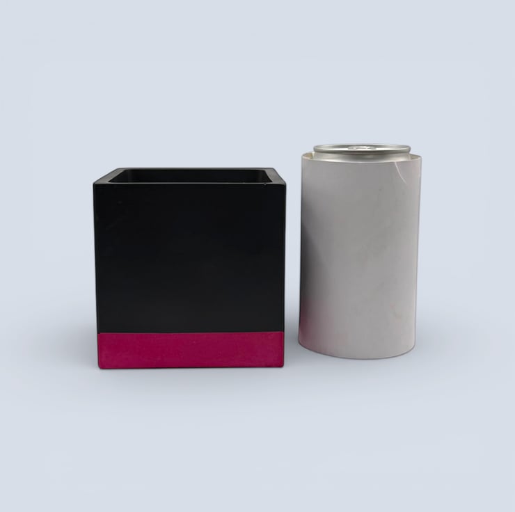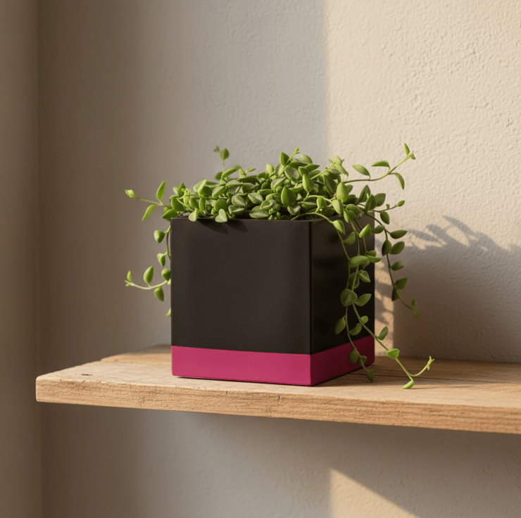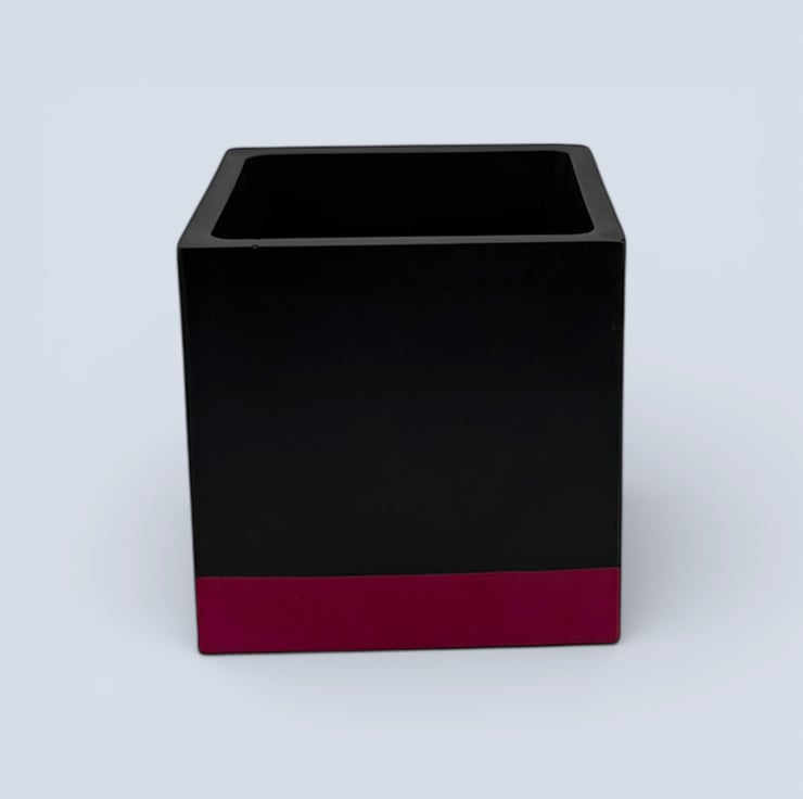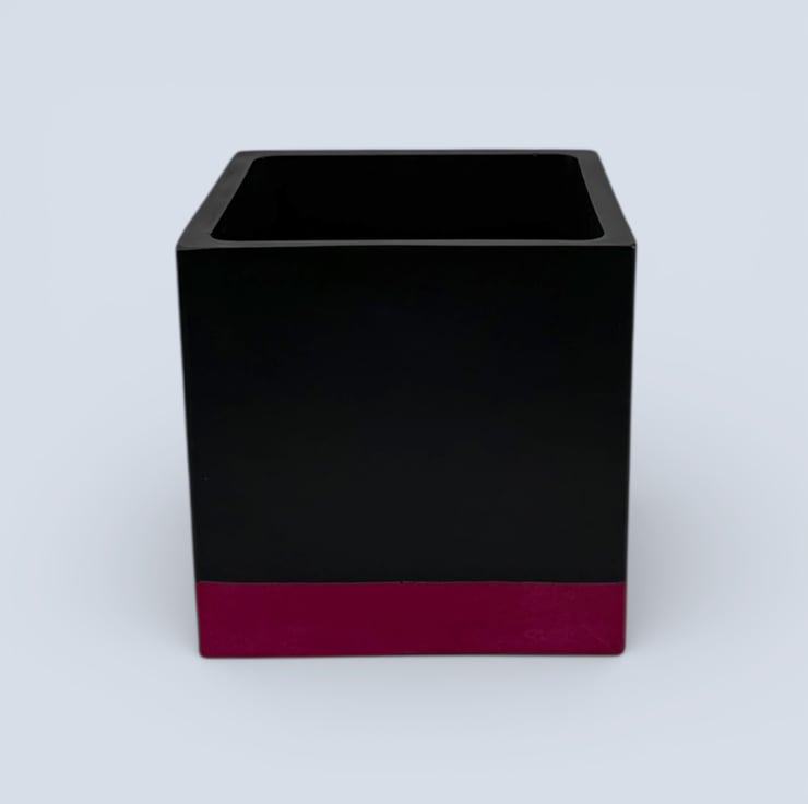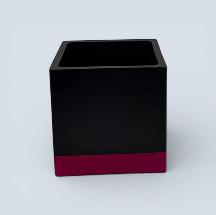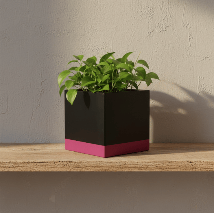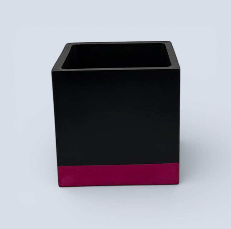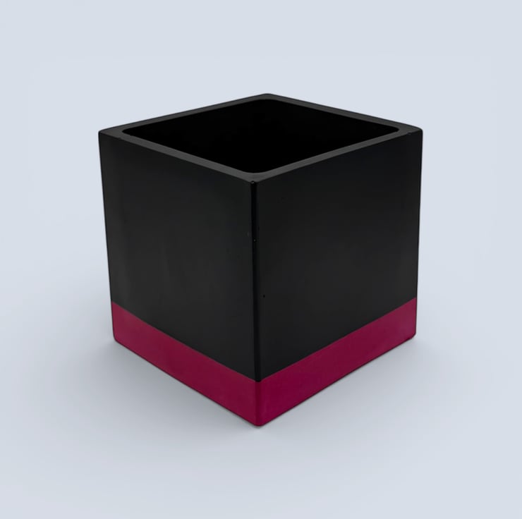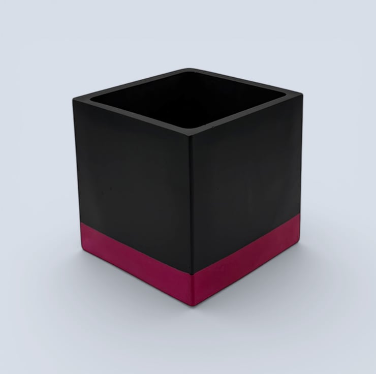 This planter was inspired by bold colour blocking and modern interior design, where simple geometric shapes are paired with strong contrast colours. The deep black body creates a clean, architectural cube form, while the vivid pink band at the base adds a bright lift of colour that draws the eye and grounds the design. The contrast between the dark upper section and the saturated base gives the pot a striking contemporary look that pairs beautifully with green foliage and works well in modern, monochrome or colourful interiors.