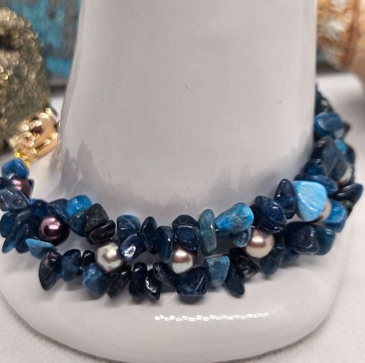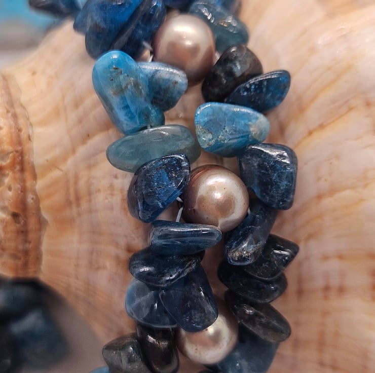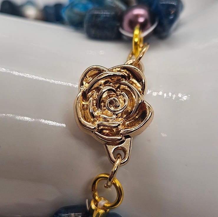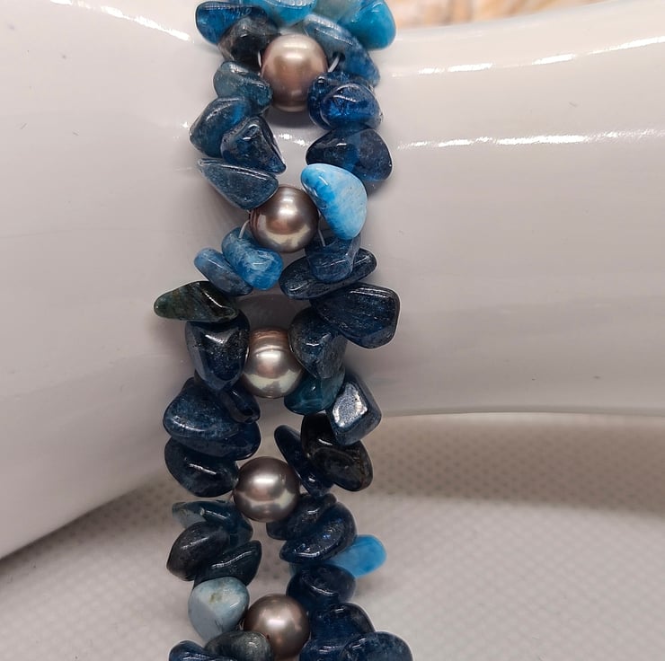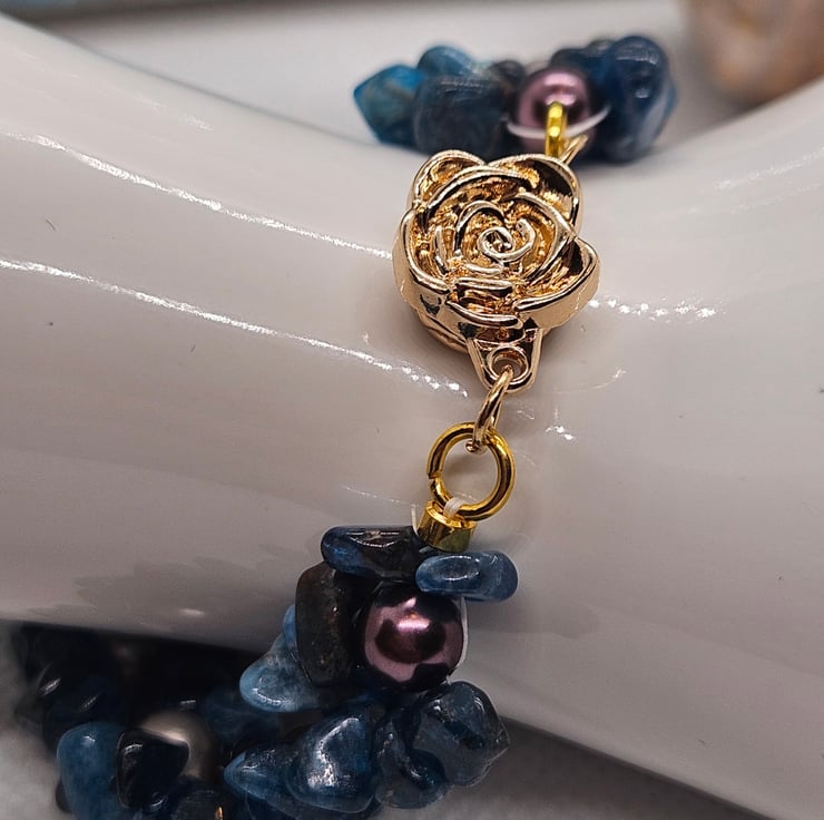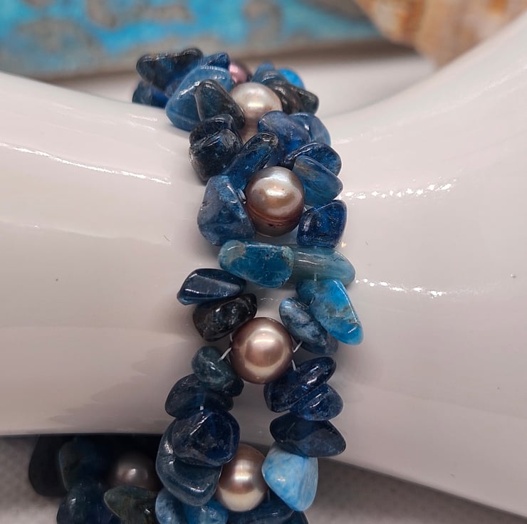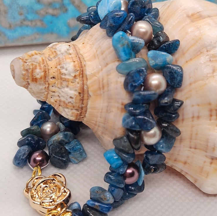 Beautiful hand made bracelet, made with Appatite irregular gemstones in gorgeous hues of deep turquoise and silver grey freshwater pearls with a couple of purple shell pearls. The natural stones are interwoven and finished with a pretty gold rose magnetic clasp. This is ideal for people who struggle with putting on and taking off bracelets. The bracelet measures 7.5". To measure to fit, measure across the bone on the wrist and add 1" to allow for drape. The bracelet will be sent in a hessian or burlap drawstring gift bag with free postage.