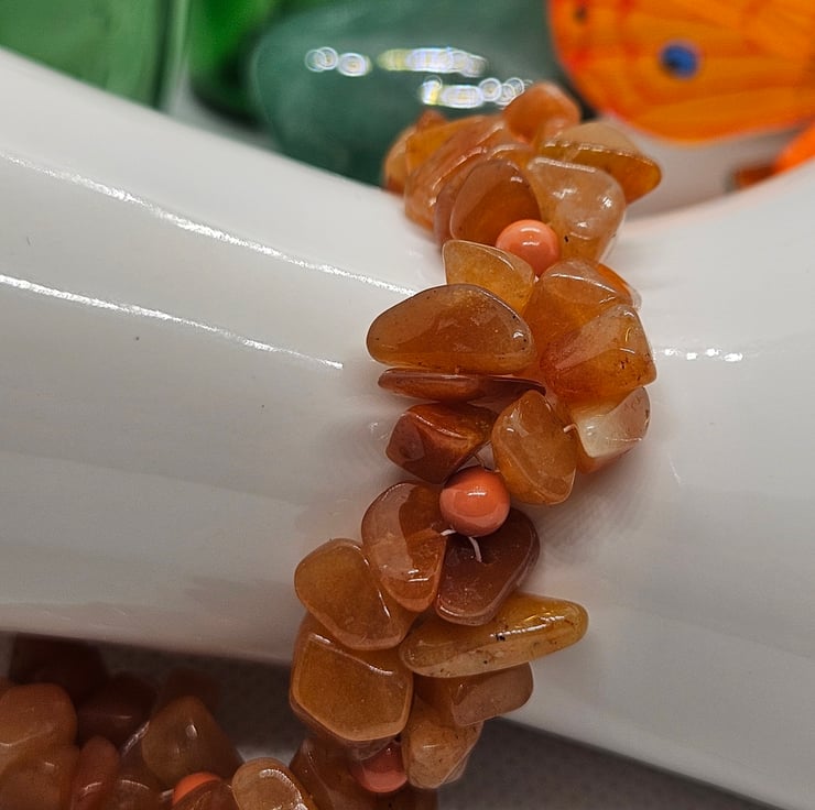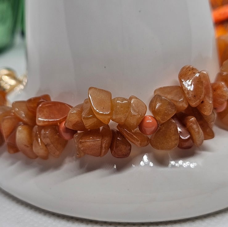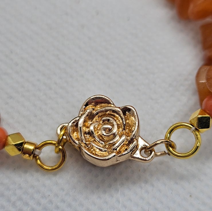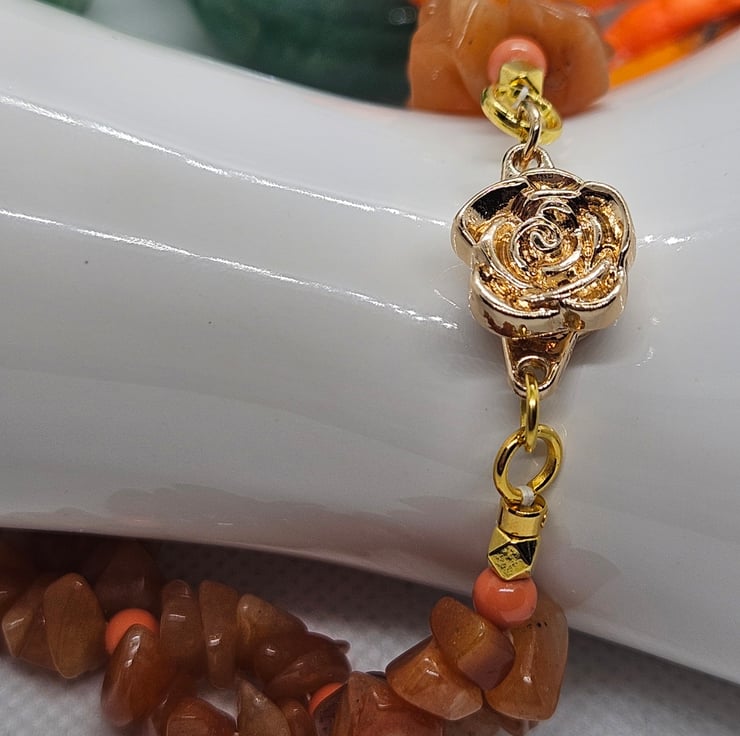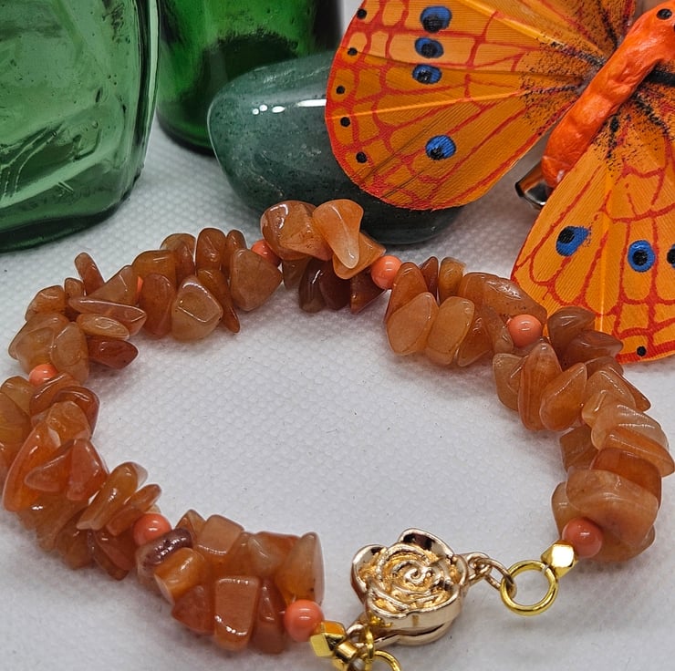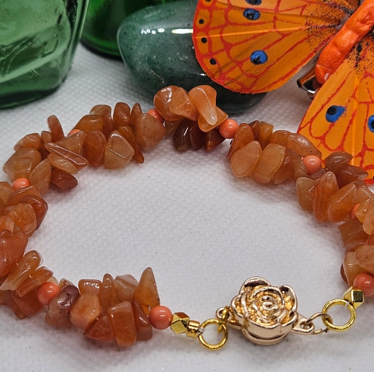 Beautiful orange Aventurine irregular shaped gemstones hand woven with orange glass beads and finished with a pretty gold rose magnetic clasp. Ideal for those who struggle to put on and take off bracelets. Bracelet measures 8". To measure to fit, measure across the bone on the wrist and add 1" to allow for drape. This bracelet will be sent in a hessian or burlap drawstring bag with free postage.