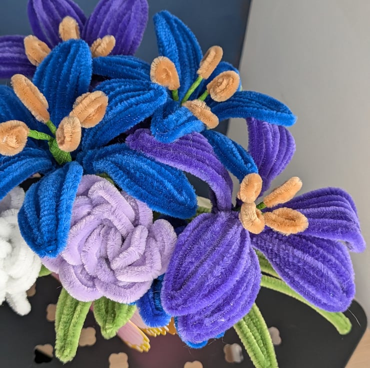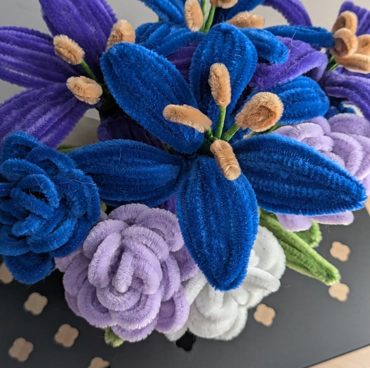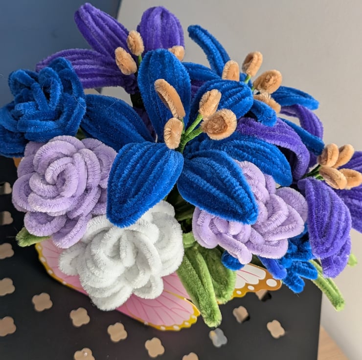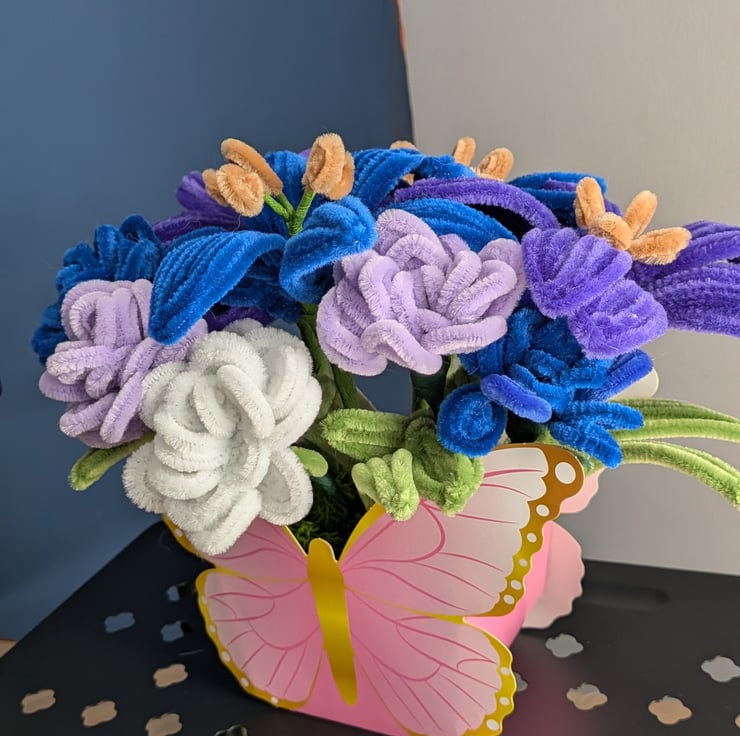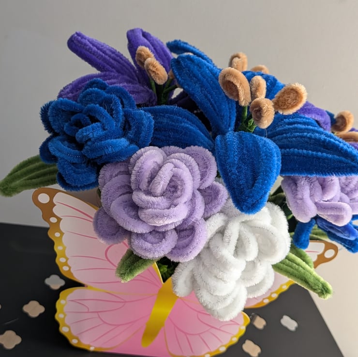 A stunning bouquet within a butterfly box, made with chenille pipe cleaners