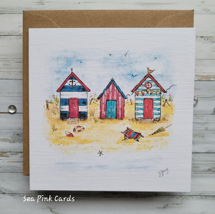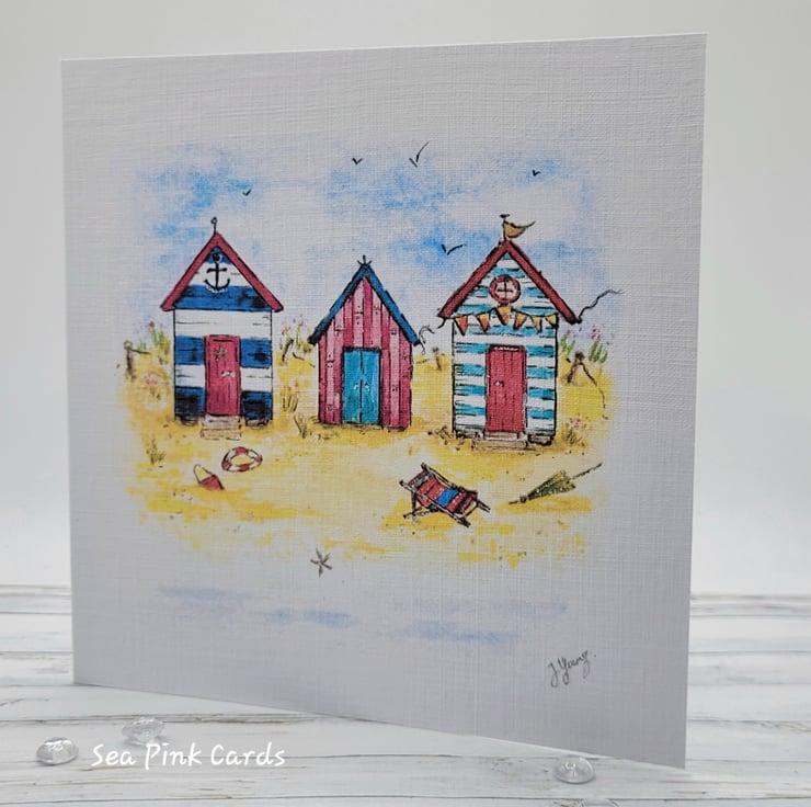 An original blank greetings card for all occasions, great for birthday greetings or for sending a note. The card has been reproduced from my own original artwork and is printed on lightly textured recycled white linen cardstock. The card measures 12.5 x 12.5 cms and features my painting of a summertime scene, of a day at the beach, complete with beach huts and lovely blue sky. It comes with a 100% recycled brown kraft paper envelope and is blank inside for writing your own message or greeting.