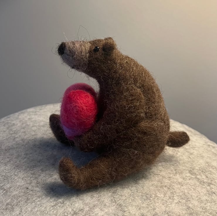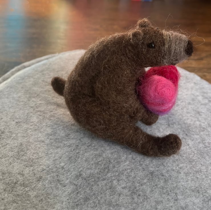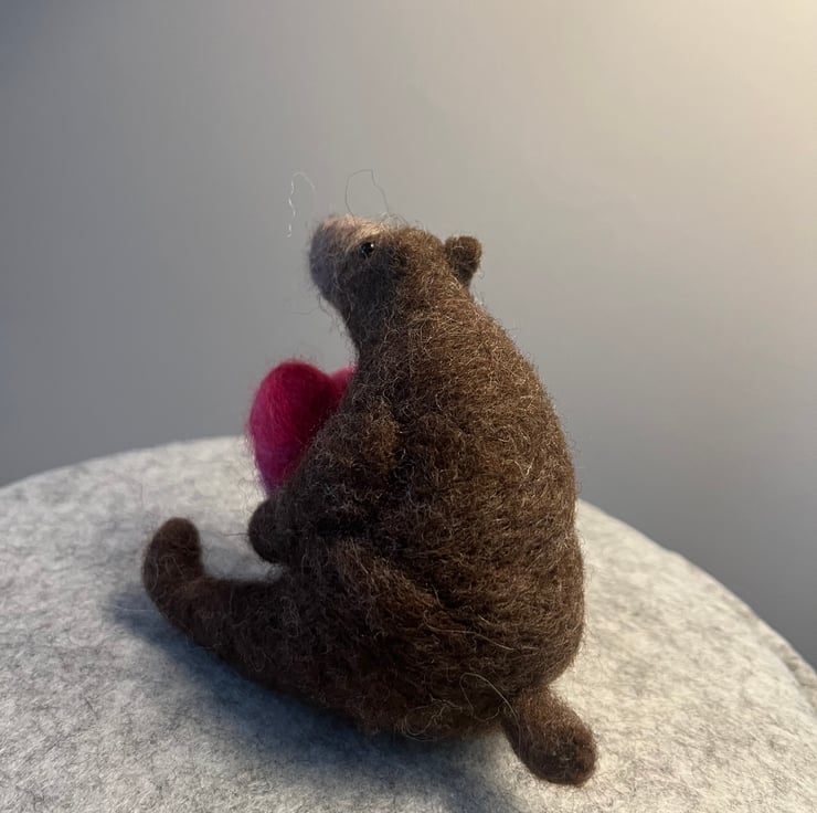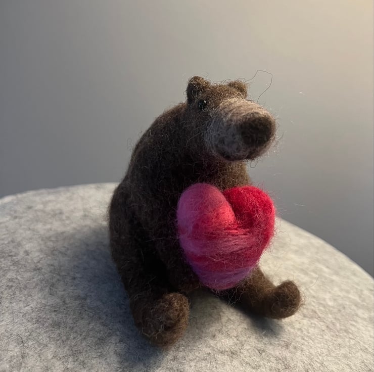 This needle felted bear is made of natural mountain sheep wool for the main body and is holding a heart made with a mixed pink wool. A perfect little gift to show someone you care.