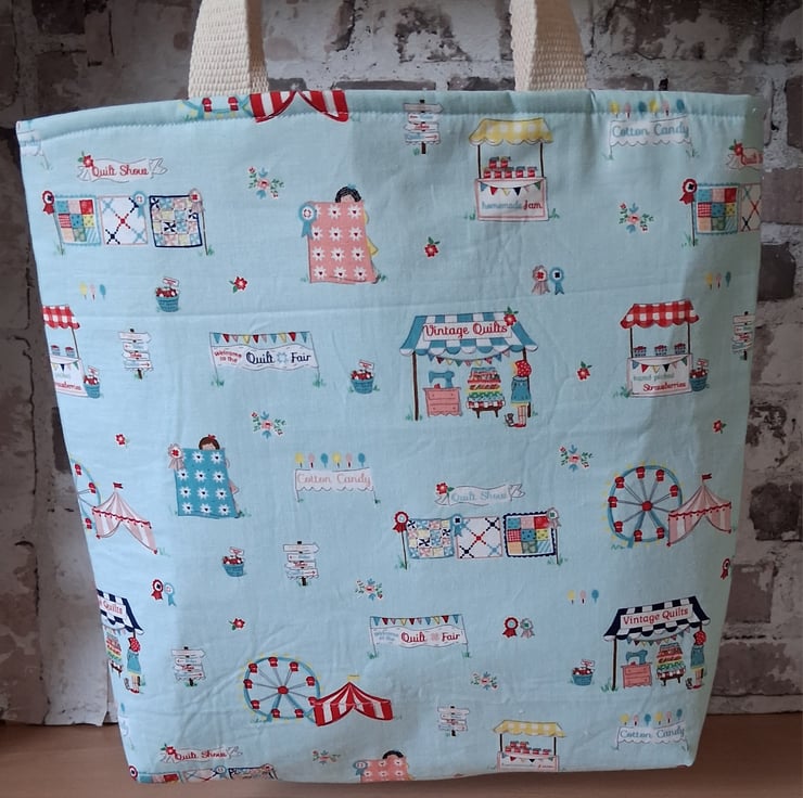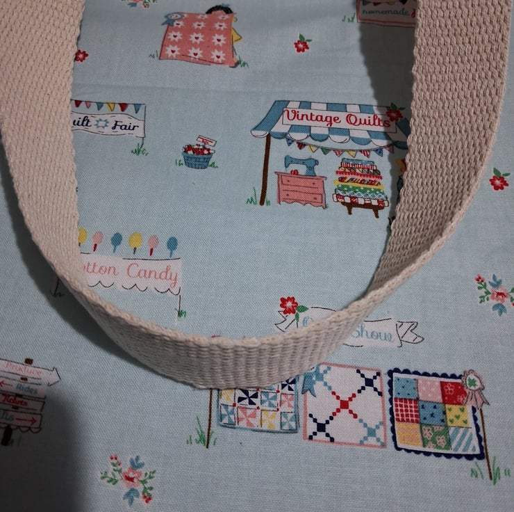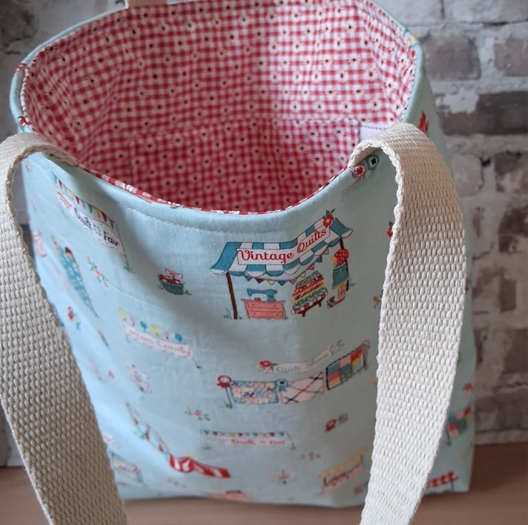 This 100% cotton tote stands out because it's different. The outer fabric features a quilt fair theme on a pale blue background, and the lining inside is a beauriful red and white gingham fabric, it also has a handy pocket inside for holding keys, phone, purse or whatever you need to find quickly.