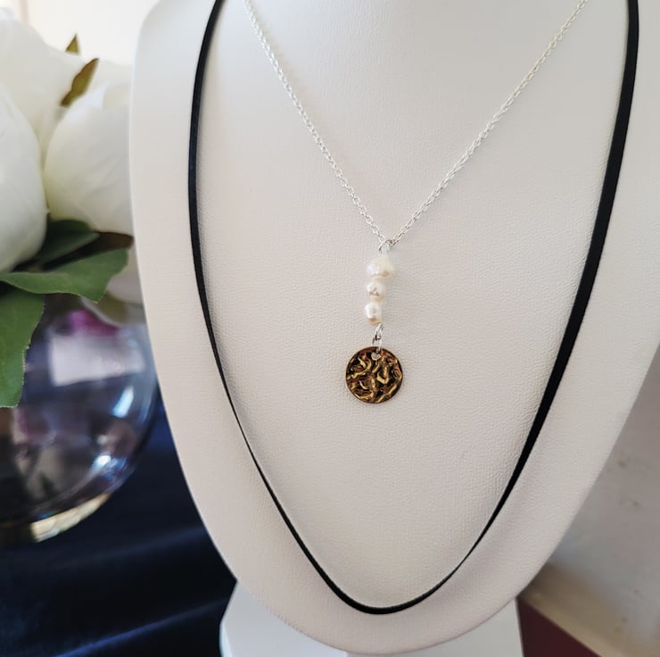 This cultured fresh water pearl charm necklace features a gorgeous black satin ribbon that makes a fabulous subtle elegant statement.