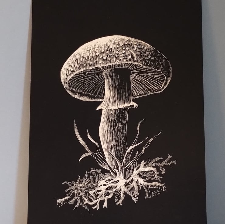 Scraperboard, also known as scratchboard, enables graphic, yet nuanced, black and white tonal drawings to be rendered using sharp scraping tools. The board consists of a layer of white china clay coated with a layer of black Indian ink which is scraped away using fine line hatching, scraping, and stippling methods to reveal the white clay. The results can evoke antique engravings and etchings which I have always personally loved. The black surface is a satin finish and the white revealed is an off-white ivory tone. Measures 15.2 by 23cm