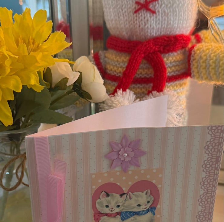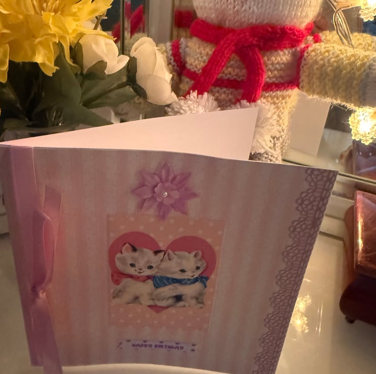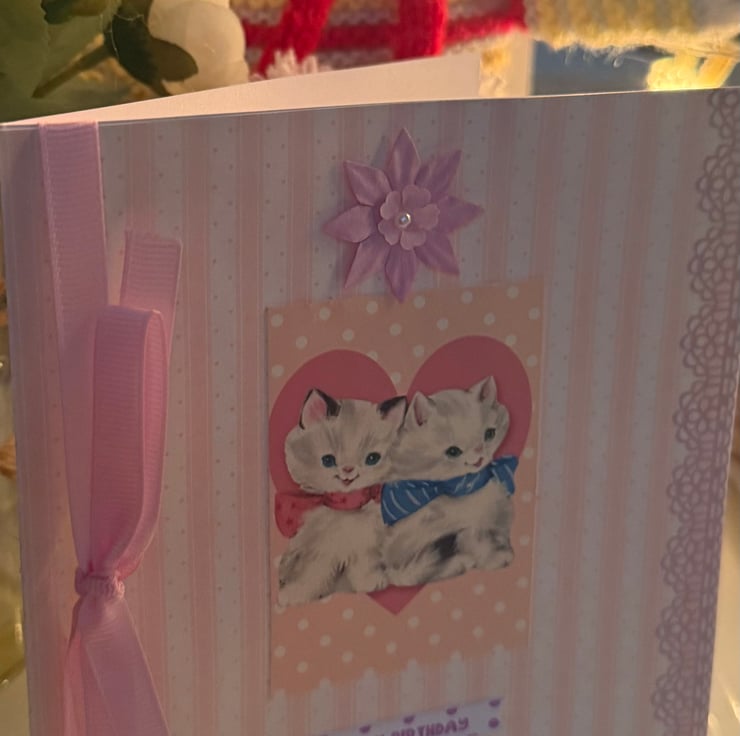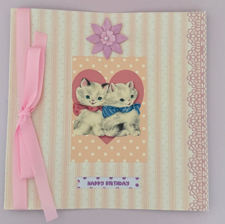 Birthday card with vintage style kittens topper, left blank inside for your own message. Has a ribbon and flower on it. Card will be placed inside a cello cover and comes with an envelope. The card is approximately 15x15cm. I will send First Class in a strong envelope.