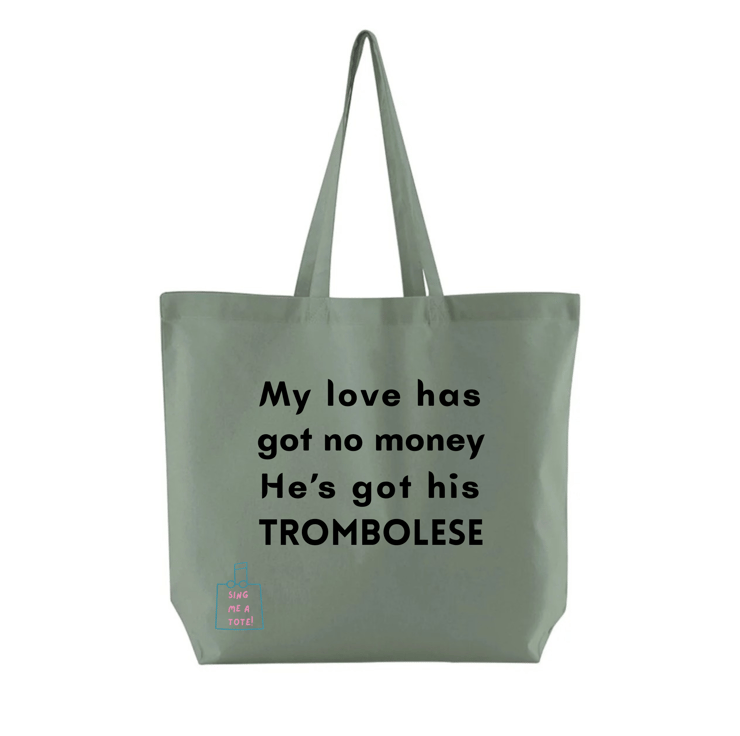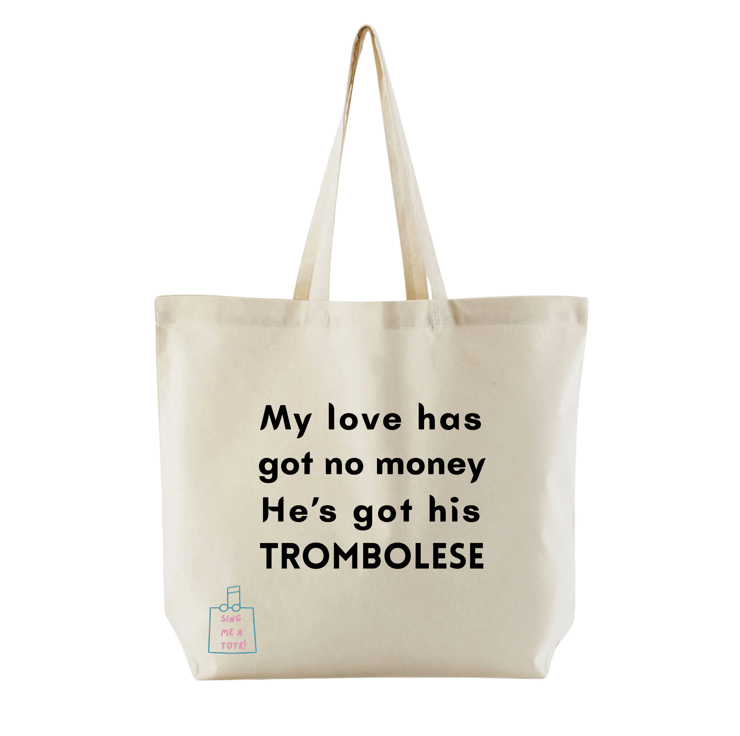 This 'He's got his Trombolese' cotton tote bag is a generous 35x39x13.5 cm with a capacity of 18 litres - perfect for carrying all those necessities whilst on the move or simply just for shopping!
