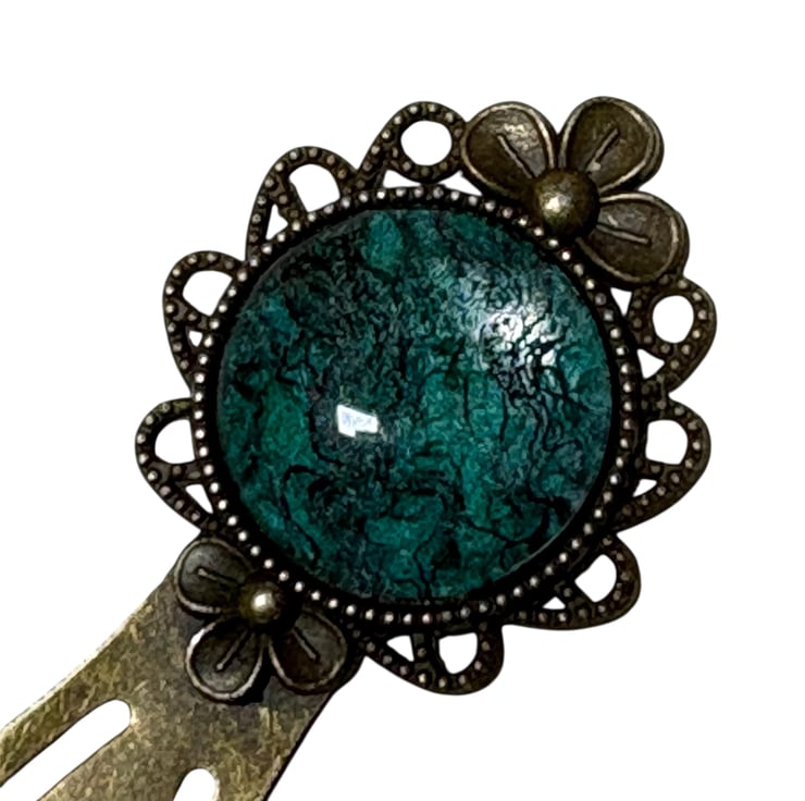 Perfect for book lovers of all ages.This bookmark consists of a teal coloured piece of wool felt topped with multicoloured silk fibres set beneath a glass cabochon in an antique bronze effect setting. The felt is made from fine layers of teal merino wool topped with multicoloured silk fibres, the colour and texture of which is enhanced by the presence of the glass cabochon.