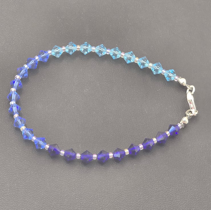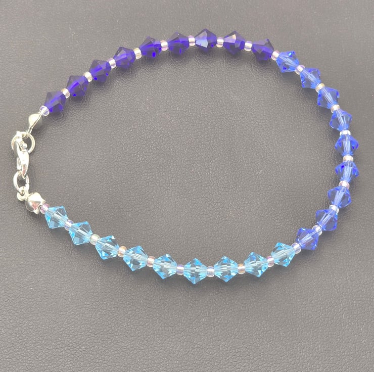 The bracelet has been made using Preciosa Crystal bicones in the colours Aqua, Sapphire and Cobalt.