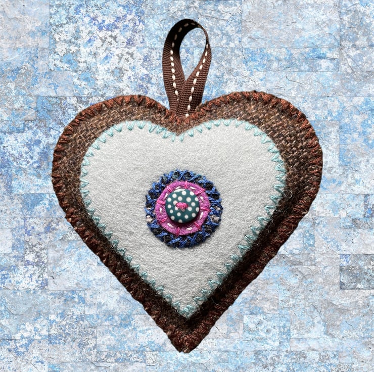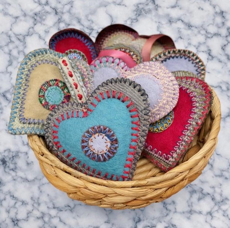 My inspiration for my heart house decorations is my love of Folk Art textiles artefacts and my aim through using traditional methods of hand stitching and embroidery alongside working with fabrics such as Wool Felt and Wool Tweed to create a modern product reflecting traditional skills and techniques .