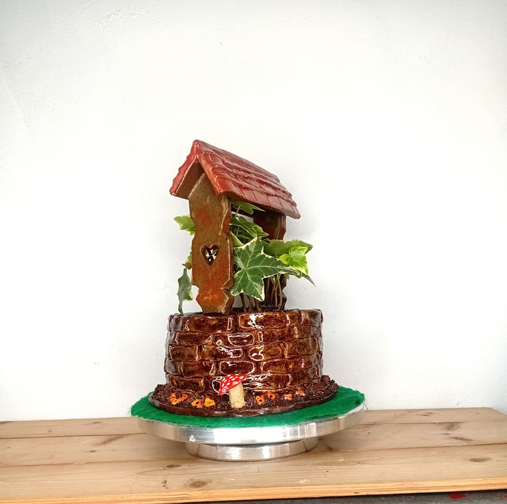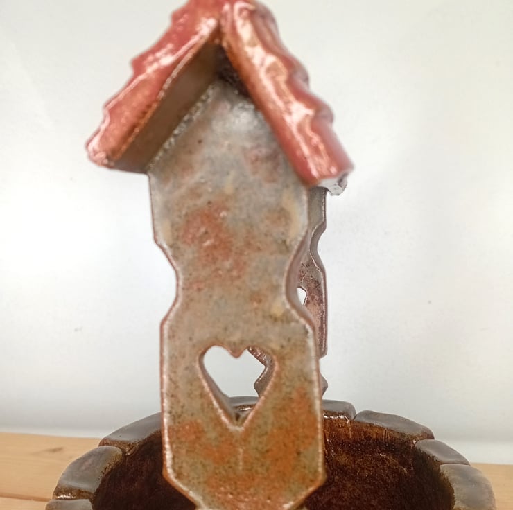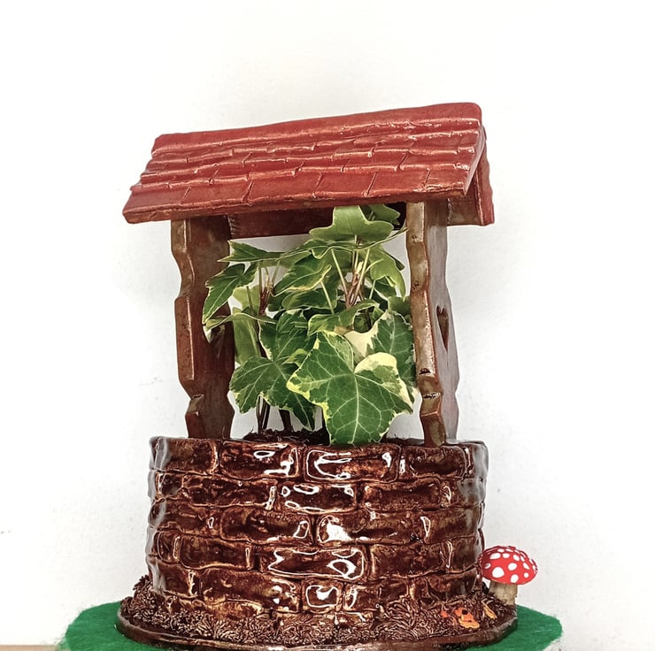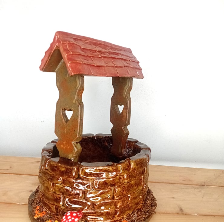 A whimsy ceramic planter wishing well .Suits all small or merdium potted trailing plants. Waterproof, suits garden or home indoors. Made from individually hand made bricks assembled to make the well and the struts have heart shapes decoration and both glazed in beautful glossy browns. The base is surrounded with ceramic grass, with a red spotted mushroom and hand painted flowers. The roof is made from individually made tiles glazed in a red shiny glaze. Could be used as a spring bulb planter or even a garden ornament as it is frost and weatherproof off the ground. Capacity 550 mls height of well 7.5 cms overall height is 23 cms the well width is 14 cms diameter, the base is 17 cms wide.