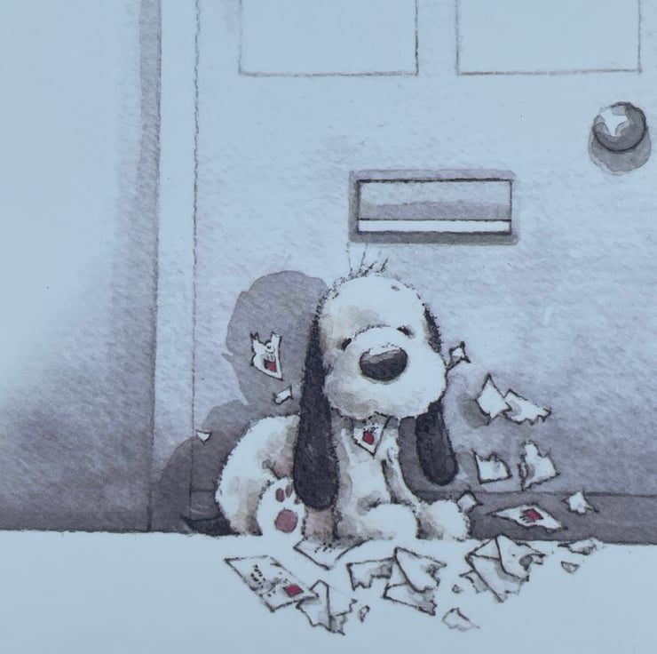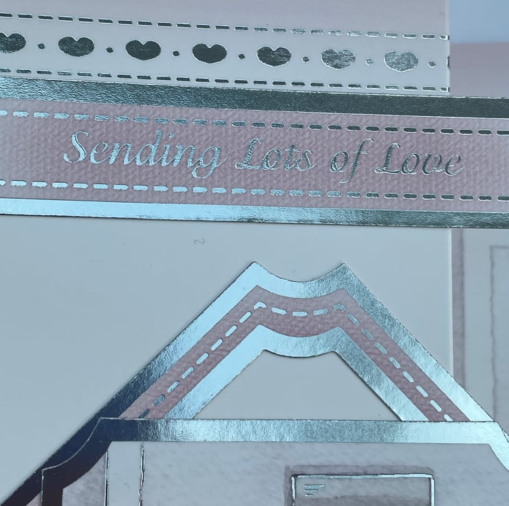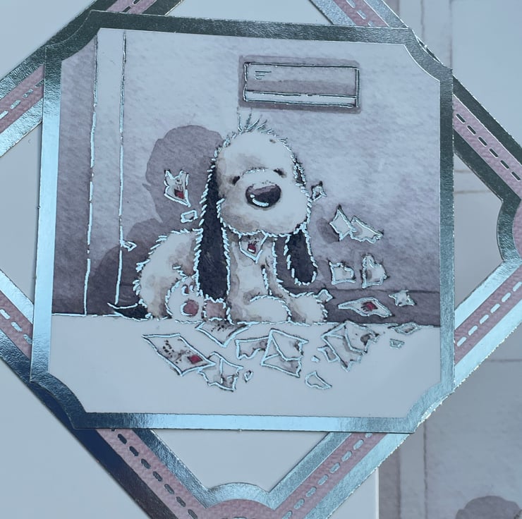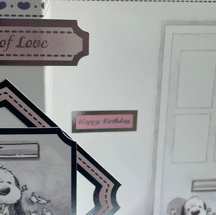 A pretty and cute card to celebrate a birthday. This A5 fold back card has a lovely soft pink base with a front door printed on it. There is a cute dog with a shredded pile of letters in front of the door. The card is folded back upon itself and the front features a cute cat. A matching image is added to the front panel with a shaped frame placed diagonally. The greeting on the front says sending lots of love and inside says Happy Birthday. The card is finished with a silver border of hearts. A lovely way to say happy birthday.