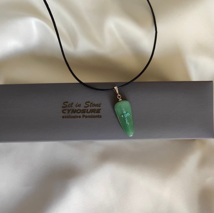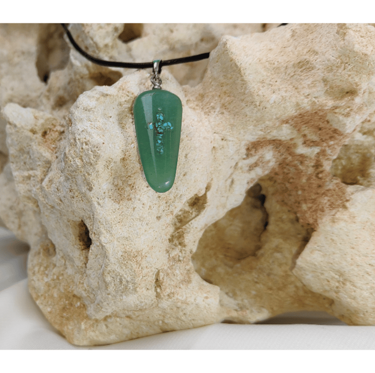Snap Boxed. A delicate green Aventurine pendant with crushed Turquoise inlayed into a Crucifix sterling 925 silver fittings on a softened, waxed leather chain. Pendant size: 3.40cm x 1.53cm.(tapered) thickness 0.76cm Leather chain width 2mm - Leather chain length 51cm (approx) Main screw bail stainless steel.