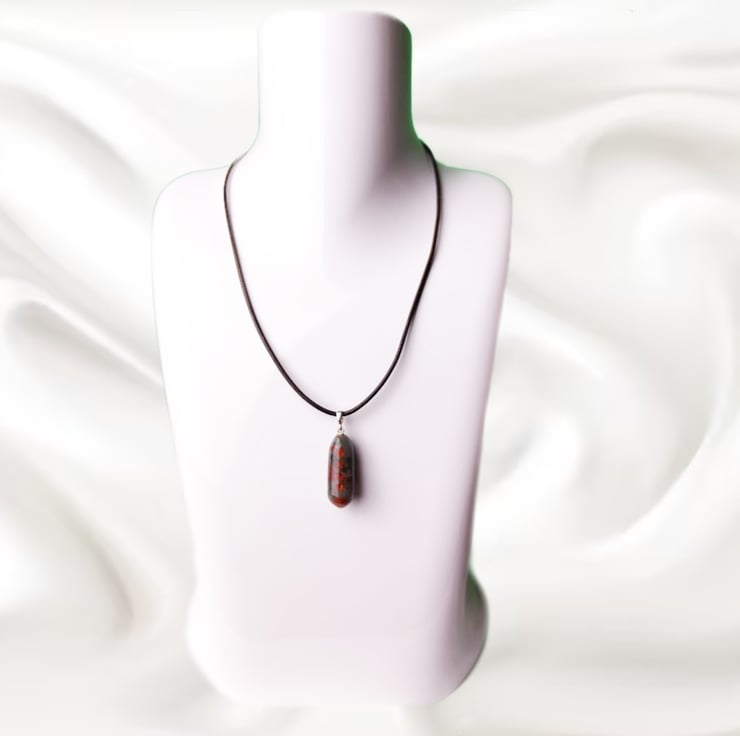 Snap Boxed. A beautiful bloodstone pendant with sterling 925 silver fittings on a softened, waxed leather chain. Pendant size: 3.53 x 1.34cm thickness 1.26cm weight 8grm, Leather chain width 3mm - Leather chain length 51cm (approx) Main screw bail stainless steel.