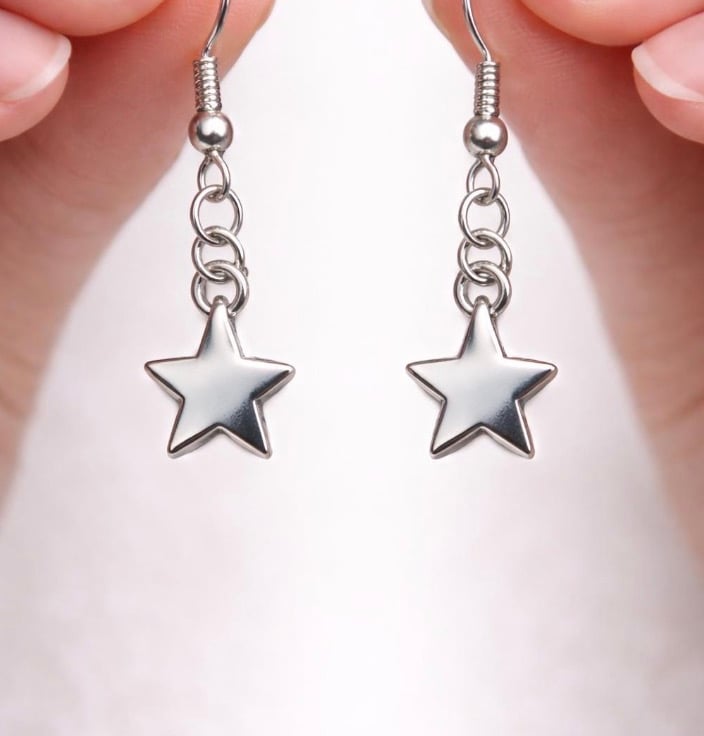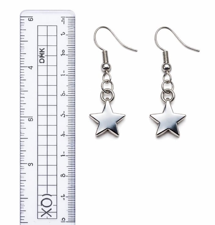 Each earring features a small five-point silver star charm suspended from delicate ear wires, creating a clean and timeless design inspired by the night sky. The simple star silhouette makes these earrings easy to style with everyday outfits while still adding a little cosmic charm.