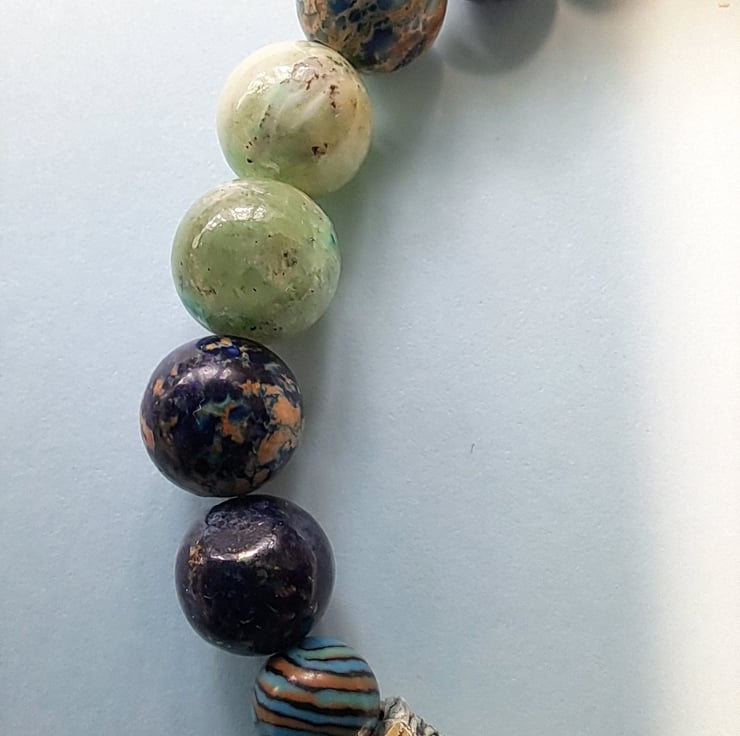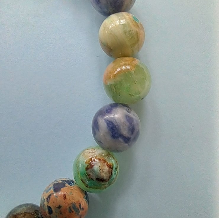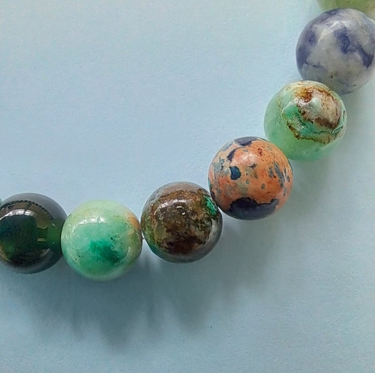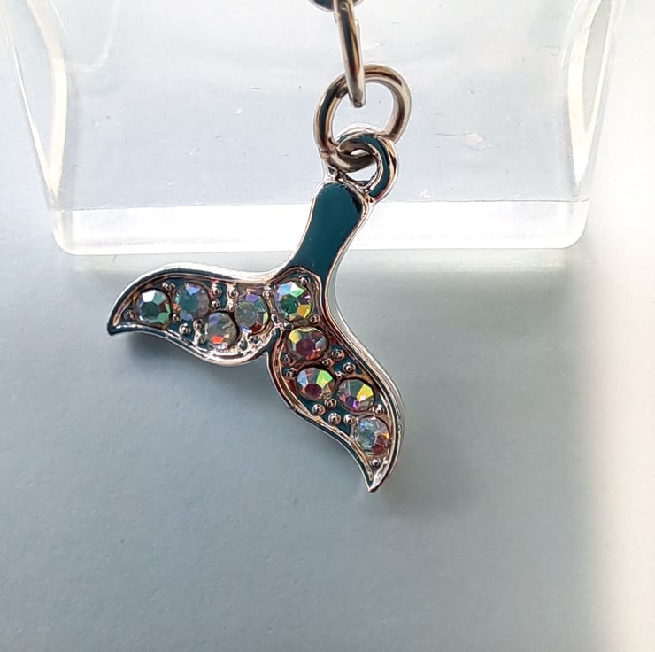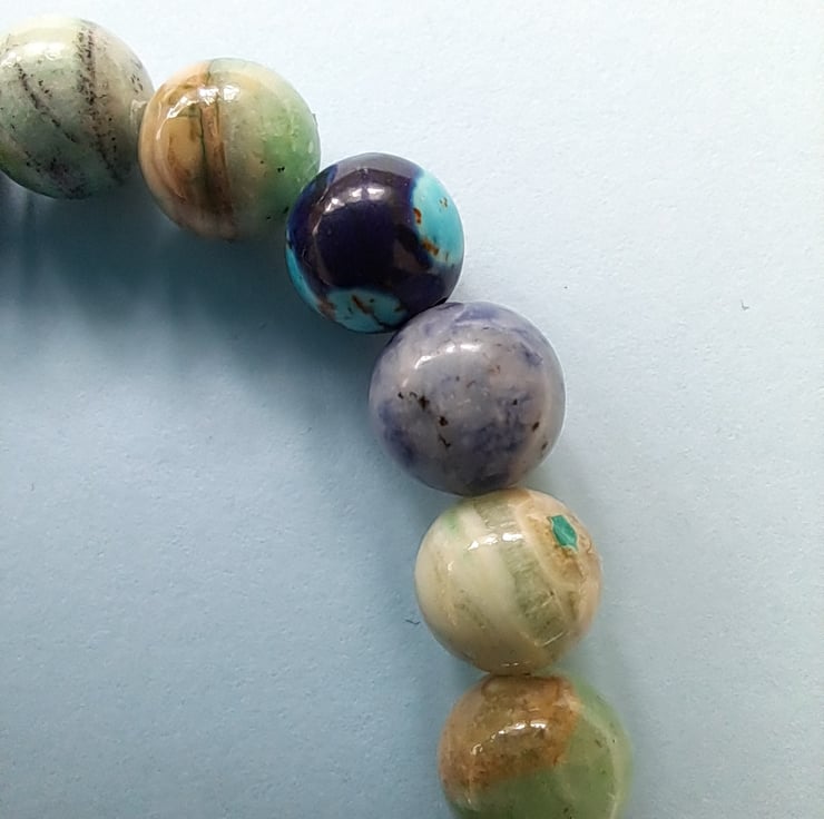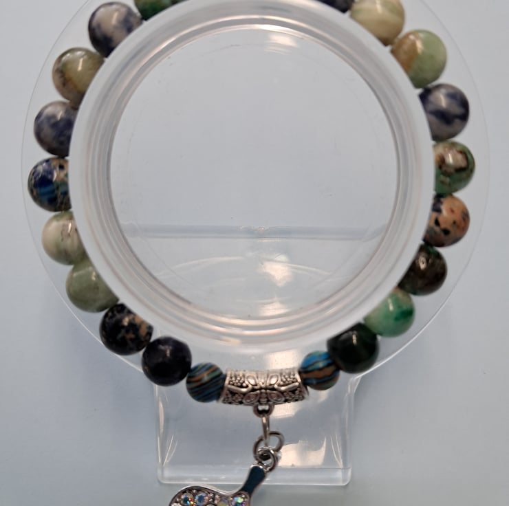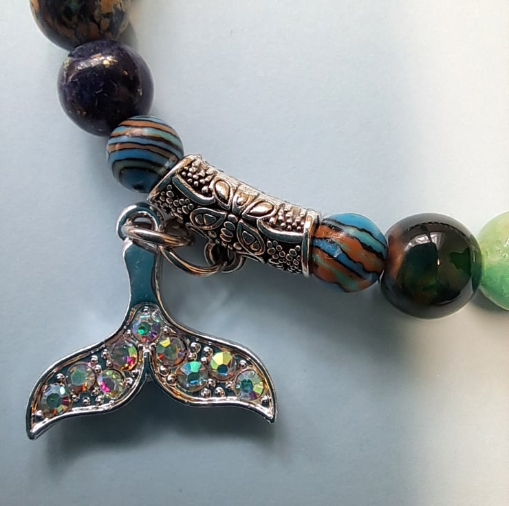 Stretch Natural stone bracelet 8mm beads, a lovely mixture of Jasper, Agate, Blue Malachite and Tibeten silver ending with AB diamante silver Whale Tail charm. Handcrafted. Will fit up to 7.25" wrist. Thankyou for looking. Lori