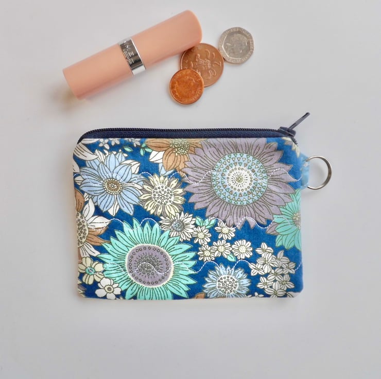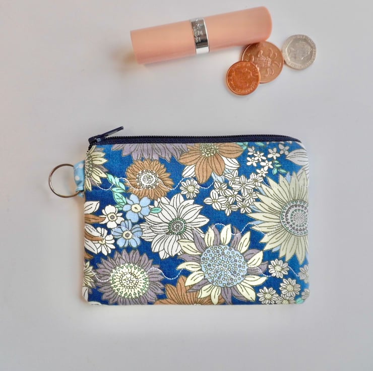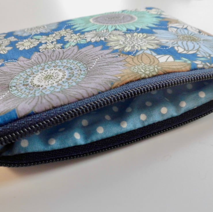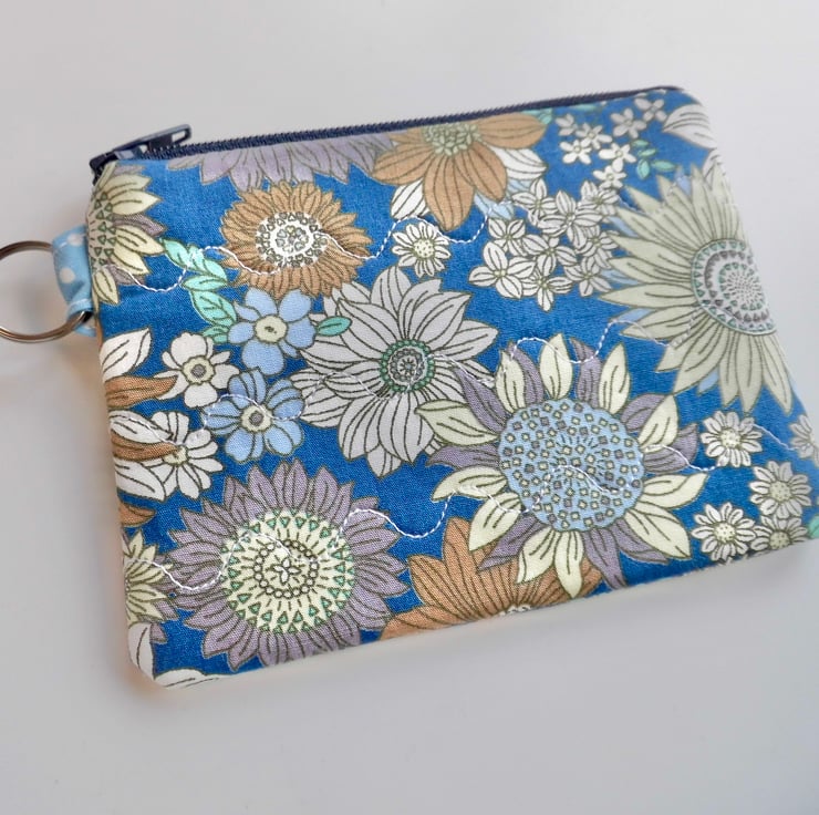 I made this coin purse using a gorgeous modern floral quilting cotton with cheerful multicoloured flowers a navy blue background. I backed this fabric with fusible quilter's wadding and machine stitched three rows across each side with a wave stitch to achieve a lightly quilted effect.