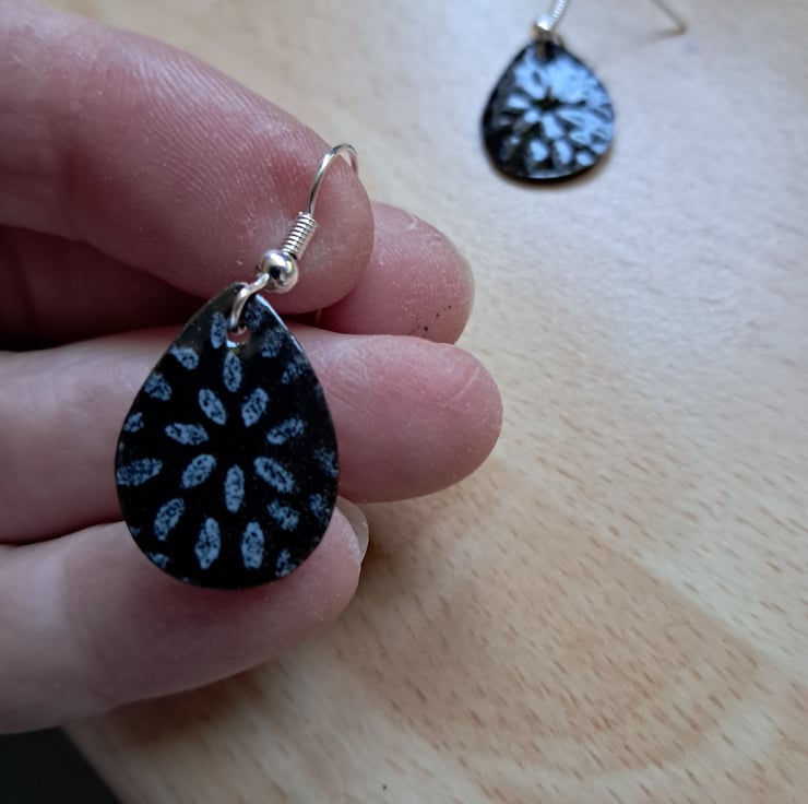 These earrings are made with enamel fired onto copper to give a durable finish. They measure 1.5 x 2cm.The design is created by stencilling a design in a contrasting colour to the base, in this case white on black The backs are also enamelled in black. The earwires are silver plated.