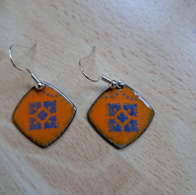 These earrings are made with enamel fired onto copper to give a durable finish. They measure 2 x 2cm.The design is created by stencilling a design in a contrasting colour to the base, in this case blue on orange. The backs are also enamelled in deep red. The earwires are silver plated.
