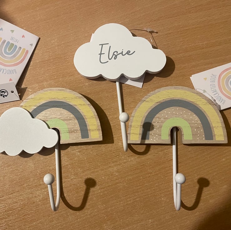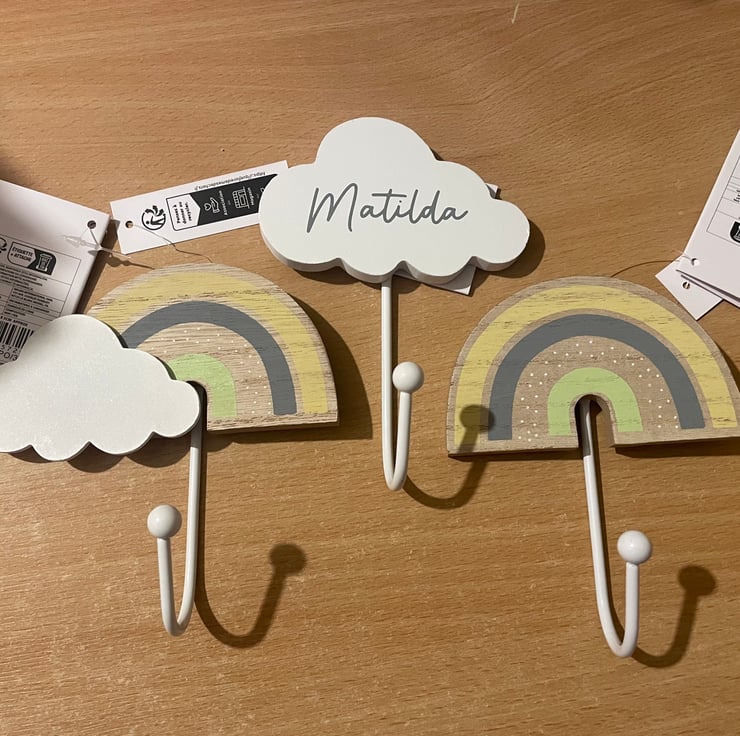 A gorgeous set of nursery hooks, with a name added, if you would rather a different colour name please ask.
