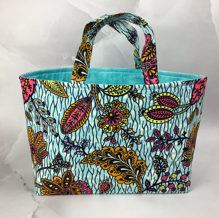 Lined in a complimentary light blue patterned cotton with 2 matching handles each 14cm (5.5") drop x 2.5cm (1").