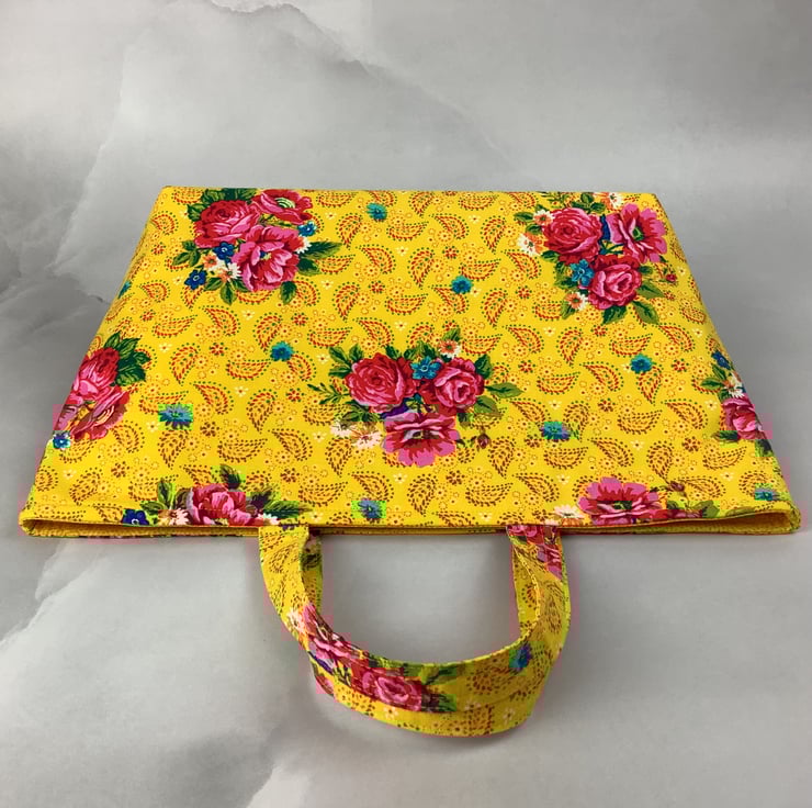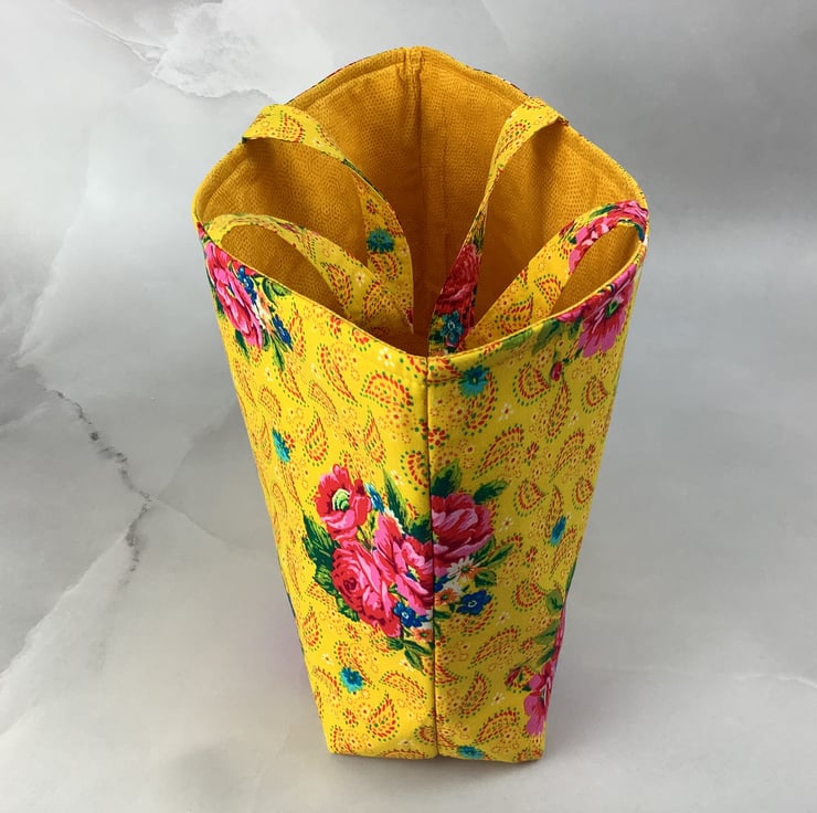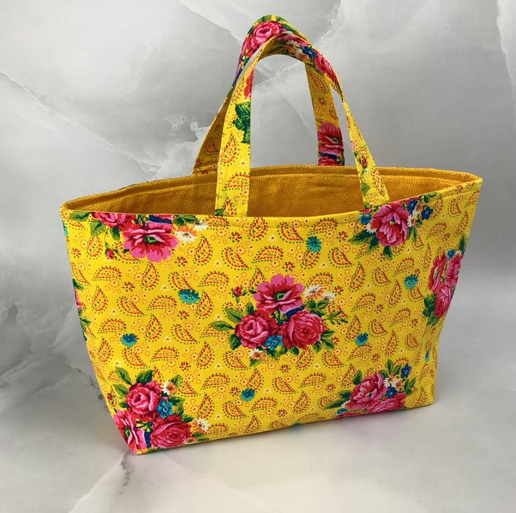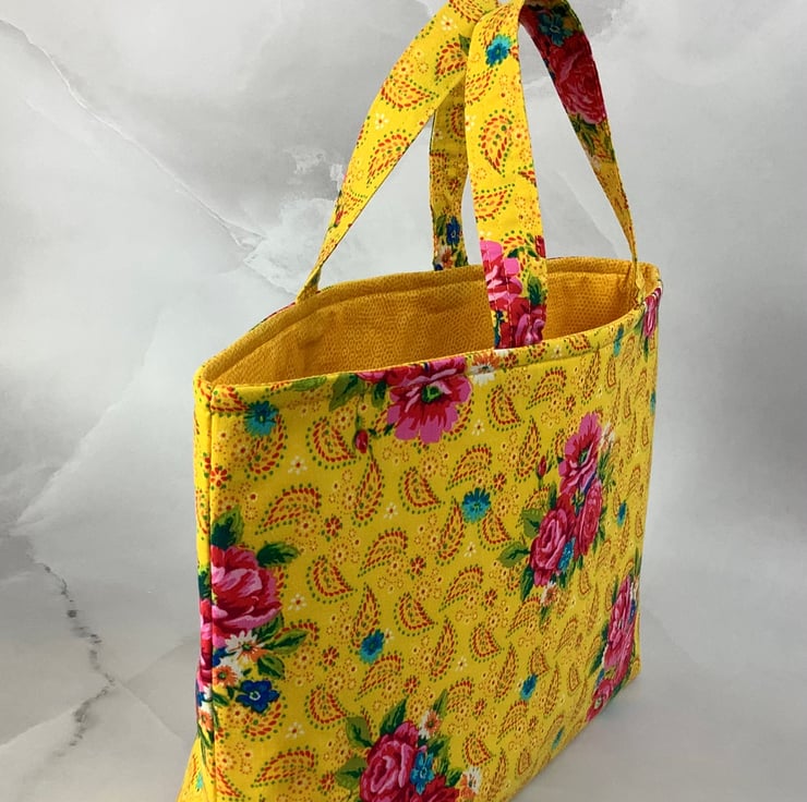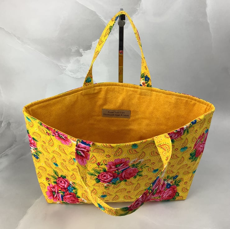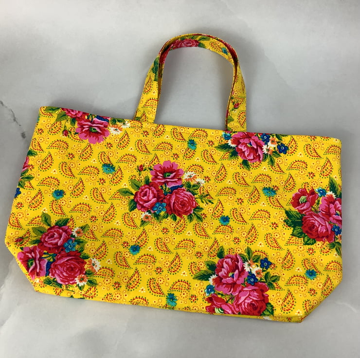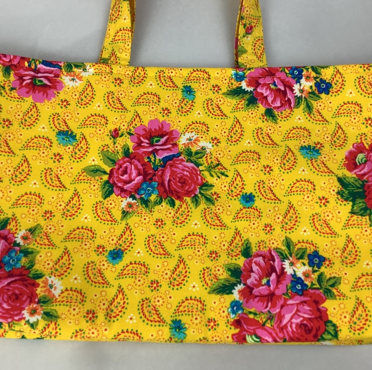 A pretty tote bag in a fun pink roses on a bold yellow cotton fabric. Perfect for shopping, work and holidays and folds flat for storage.