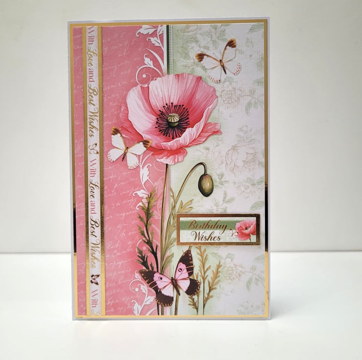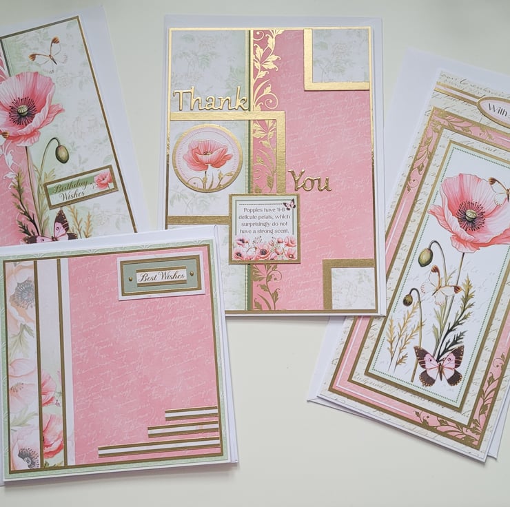 Send a thoughtful message with this beautiful handmade set of four coordinating greeting cards, featuring soft pink poppies, delicate butterflies, and elegant vintage-inspired details. Each card has a unique design while keeping a cohesive floral theme, making the set perfect for gifting or keeping on hand for special occasions.