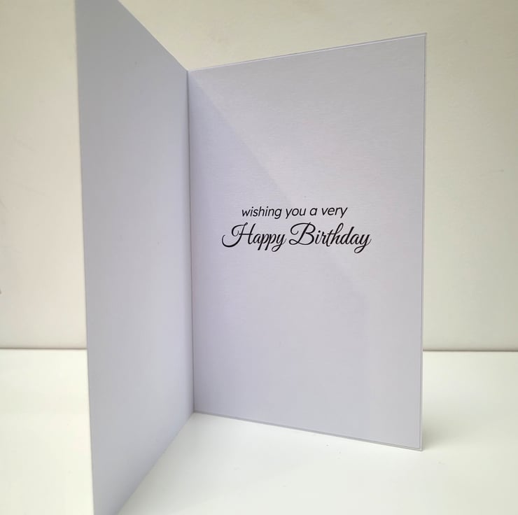 - The 'Birthday Wishes' card has a printed sentiment on the inside which reads "Wishing you a very happy birthday"
