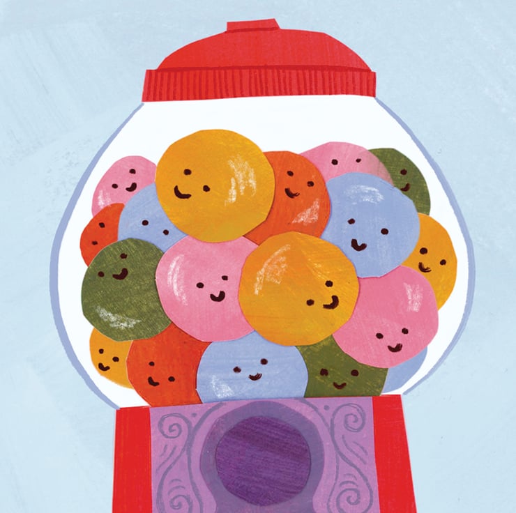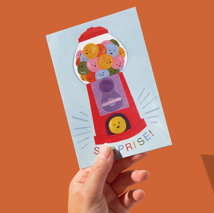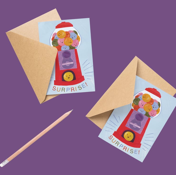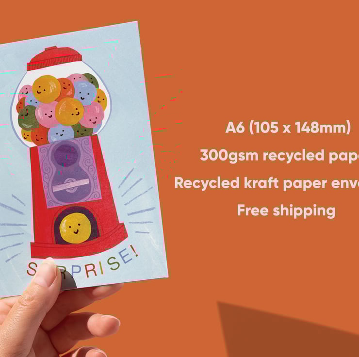 A cute and unique greetings card illustrated by Hayley Wells. With a happy, colourful gumball machine and the word "Suprise!", this vintage-inspired card is perfect to send to friends and loved ones. Whether it's for birthdays, special occasions, or simply to say "hello", this card is sure to bring a little bit of colour to someone's day.