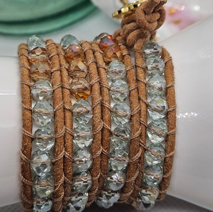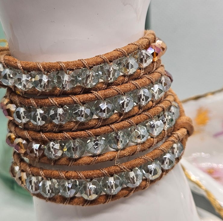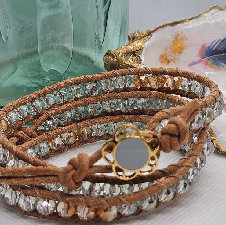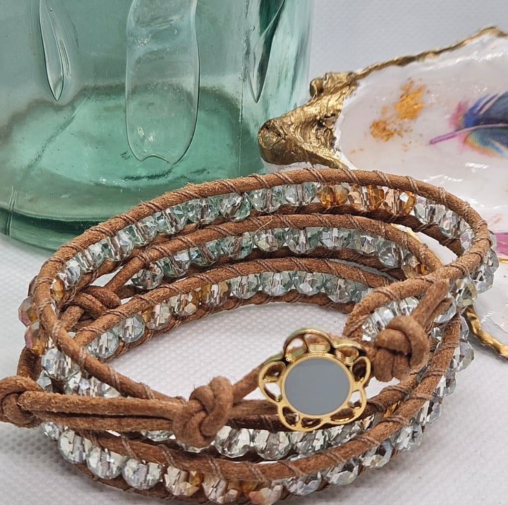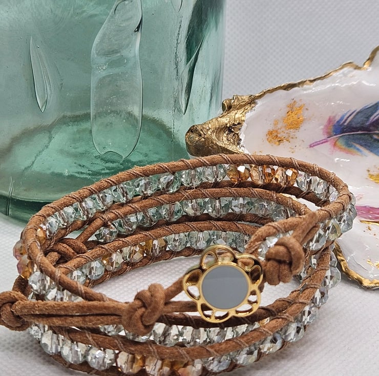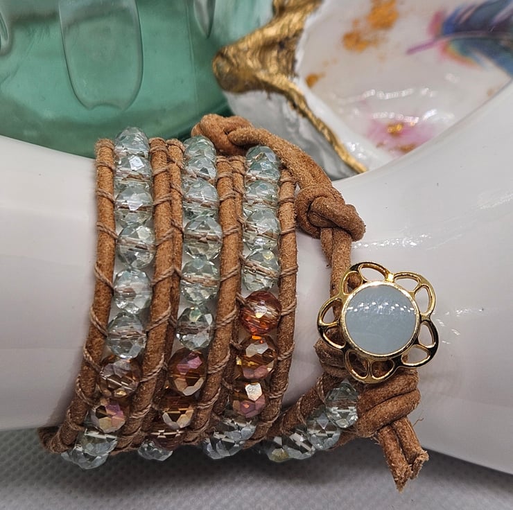 Beautiful natural leather triple wrap bracelet made with very pale blue AB faceted czech glass beads and light bronze AB faceted czech glass beads and finished with a pretty light blue-grey flower shaped clasp. Wrap bracelets look great alone or with other stacking bracelets to create a boho style look. Adjustable to fit three sizes. The bracelet measures 23". It comes gifted in a drawstring jewellery bag and is free of postage.