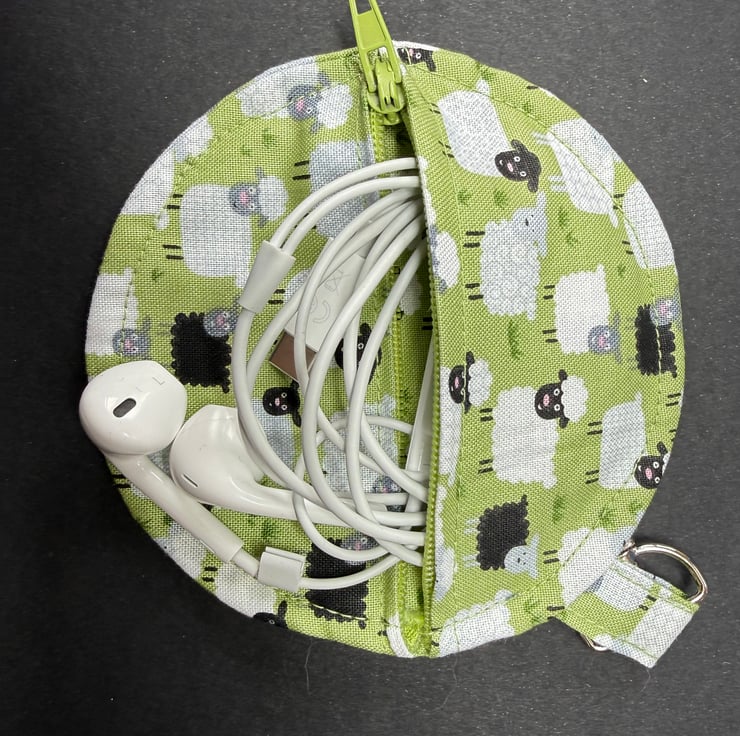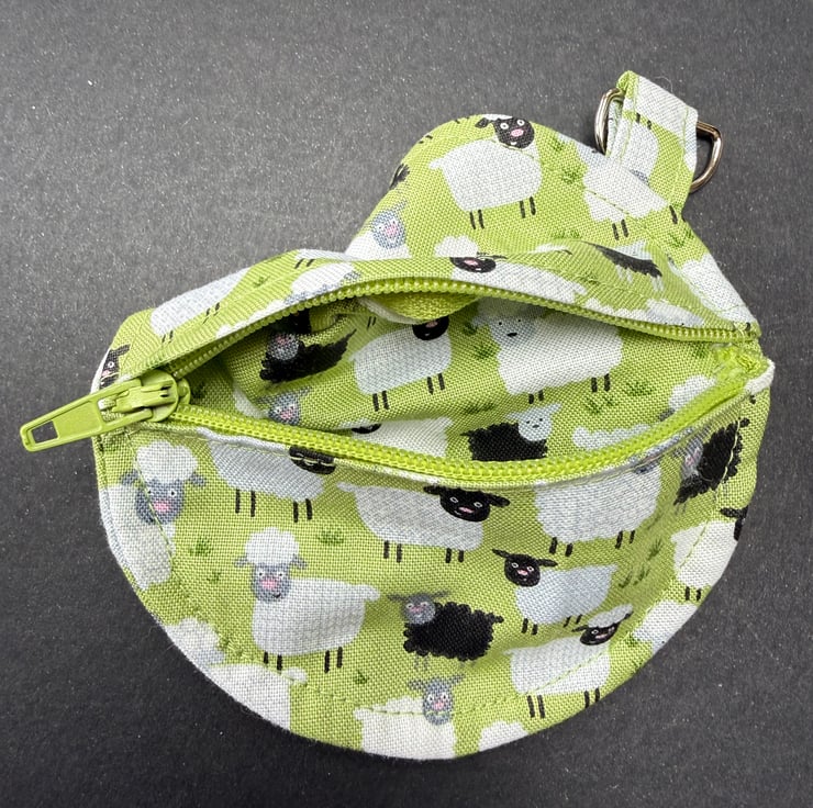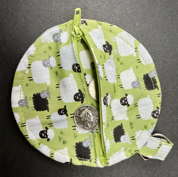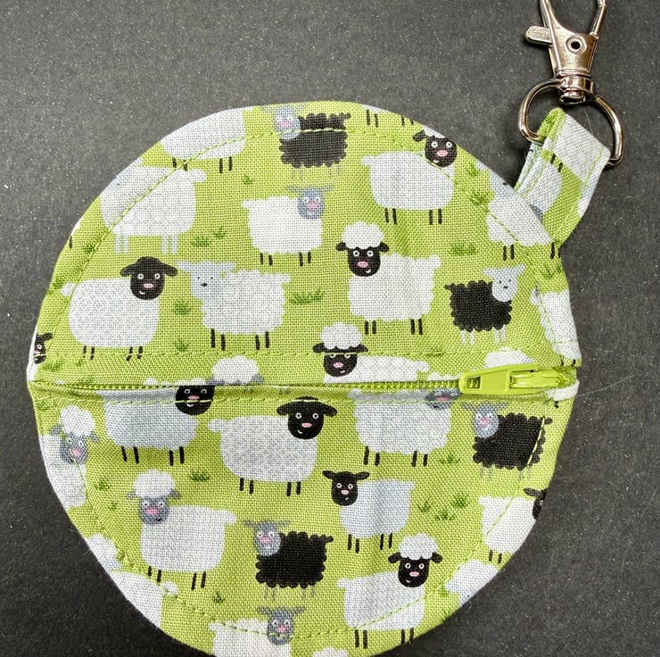 A small circular zipped pouch made from soft cotton fabric showing a lively mix of sheep in white, black and white with black faces, all set against a gentle light green background that suggests fresh spring grass. The matching green zip opens smoothly, and the silver coloured lobster clasp allows the pouch to be clipped inside a bag, onto a belt loop or anywhere you like to keep small essentials close at hand.