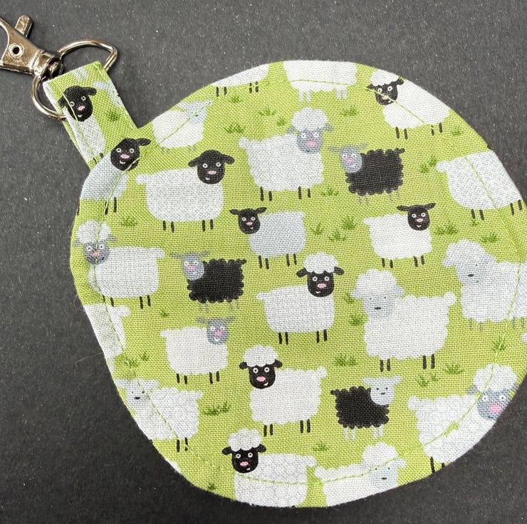This design grew from a love of cheerful countryside fabrics and the gentle humour of sheep grazing on soft green fields. The circular shape echoes the friendly roundness of the sheep themselves and creates a small, tactile accessory that feels comforting to hold.