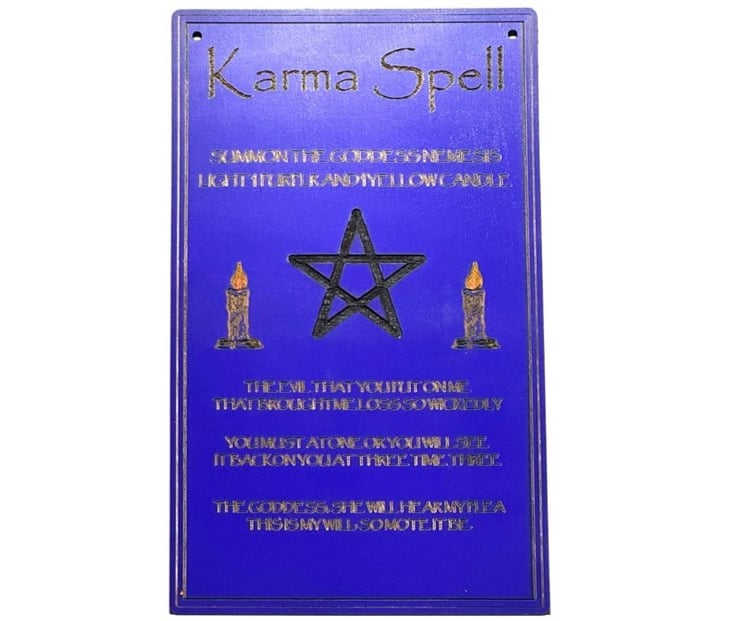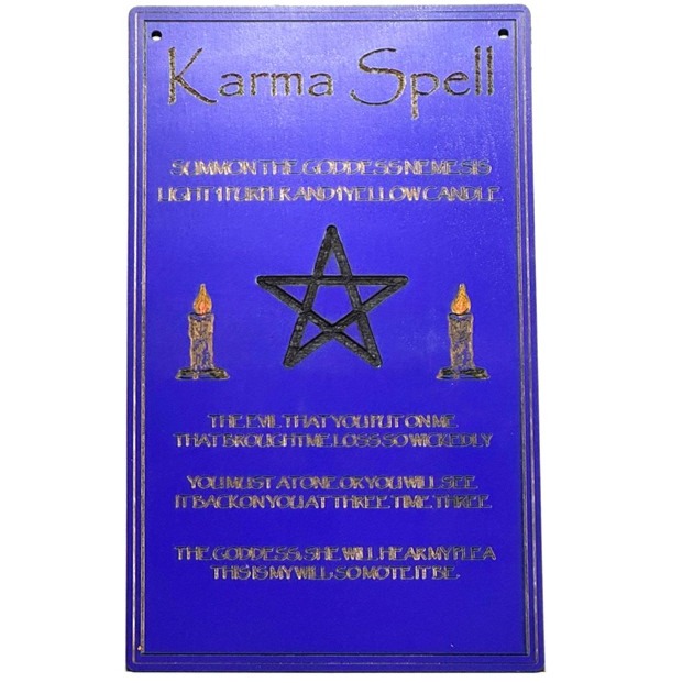 Channel positive energy and ward off negativity with this striking "Karma Spell" plaque, precision-cut from 3 mm blue-coloured plywood and detailed with laser-etched text and imagery.