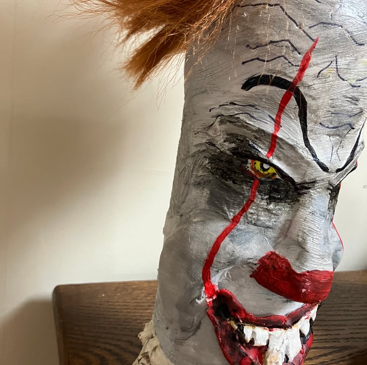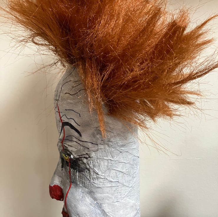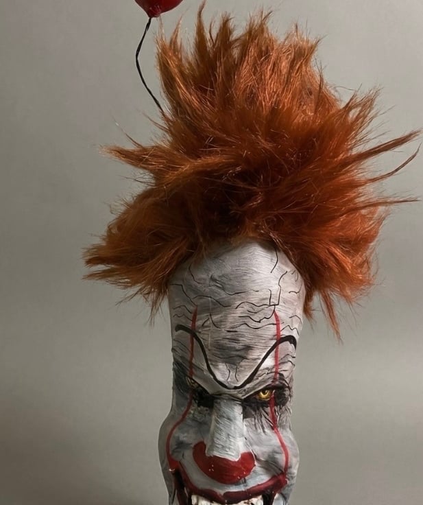 Finished with wild, textured hair and a signature red balloon accessory.