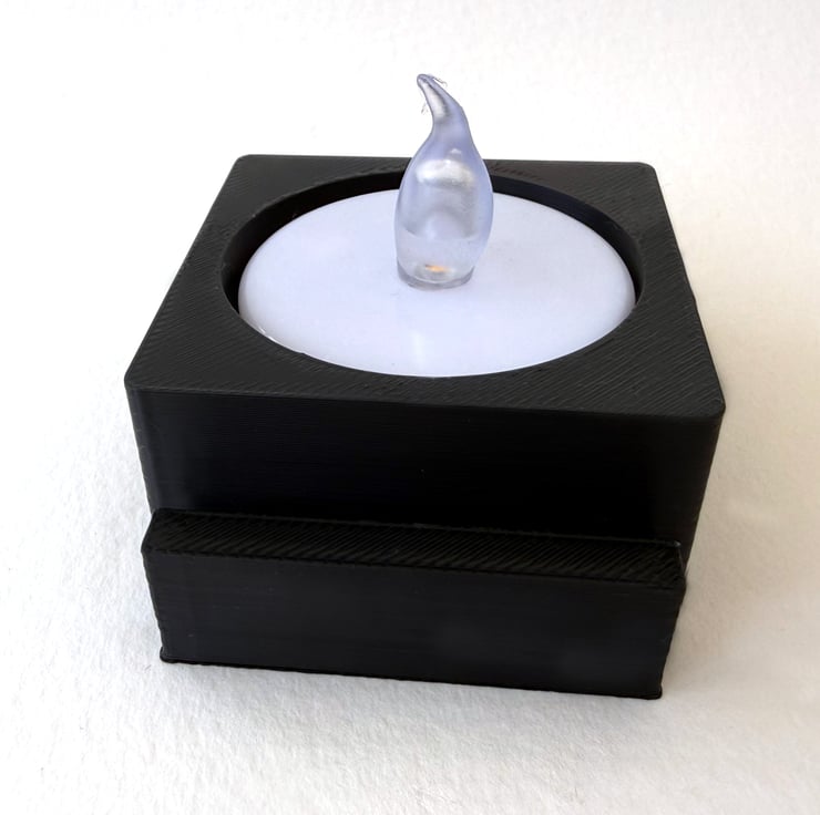 Shown with a 10x23cm tack fused panel. The stand is 45mm wide, 20mm high and 55mm deep from front to back. The tea light holder fits a 33-37mm diameter battery powered tea light - do not use with a real candle. The back is printed "BATTERY ONLY" and the flame candles that I have checked will not fit in the hole.