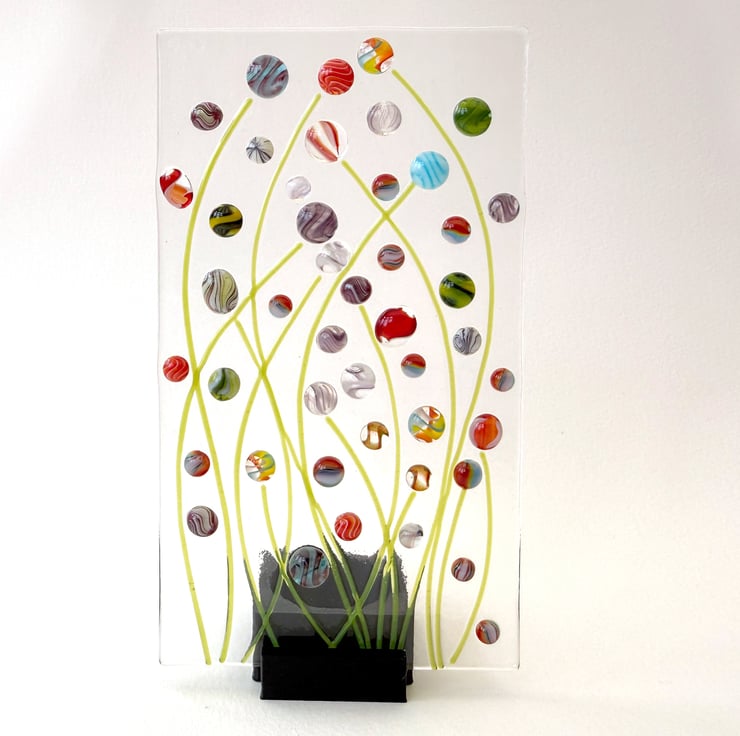Pack of 5 black display stands to hold fused glass panels with a holder for a battery powered tea light behind, would also work well for mosaic, painted glass or stained glass pieces.
