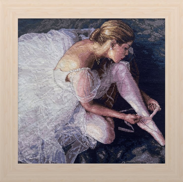 Bring a touch of grace and elegance to your home with this beautifully crafted cross stitch artwork featuring a serene ballet dancer preparing for her performance. The piece captures a quiet, intimate moment as the dancer sits to tie the ribbons of her ballet shoes, dressed in a delicate white tutu with soft, sheer sleeves.