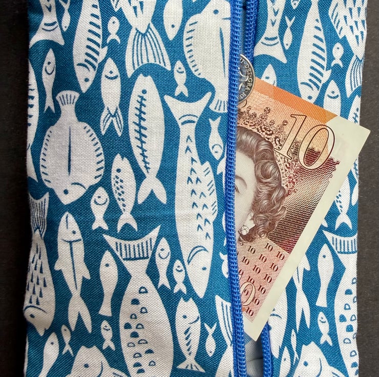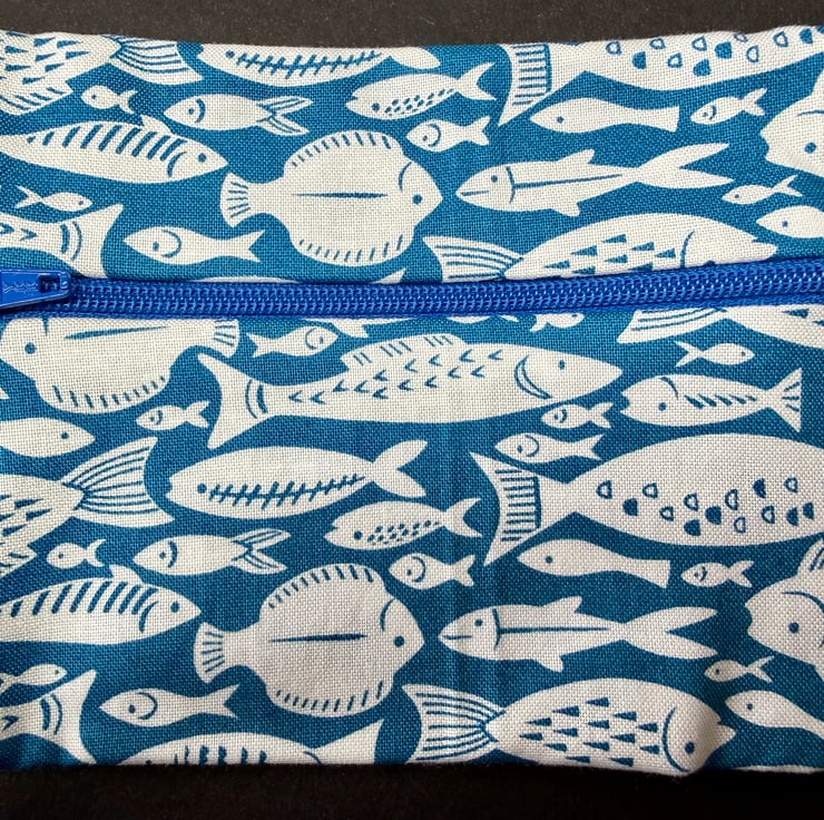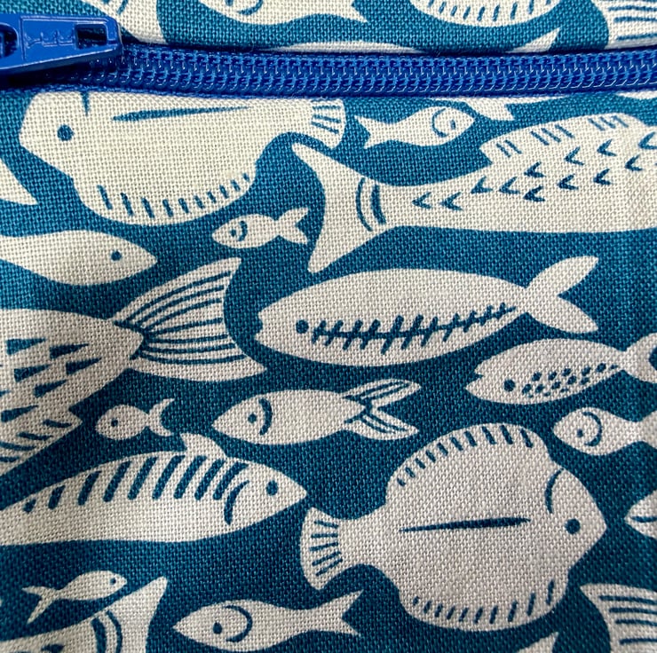 This compact zipped purse is made from a mid blue cotton covered in all sorts of fish with white and blue accents. The print has a lively coastal feel and the colours make it especially appealing for children and for anyone who loves the sea. The front panel is finished with an easy glide blue zip that matches the background perfectly.