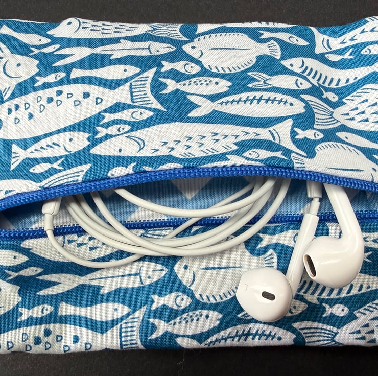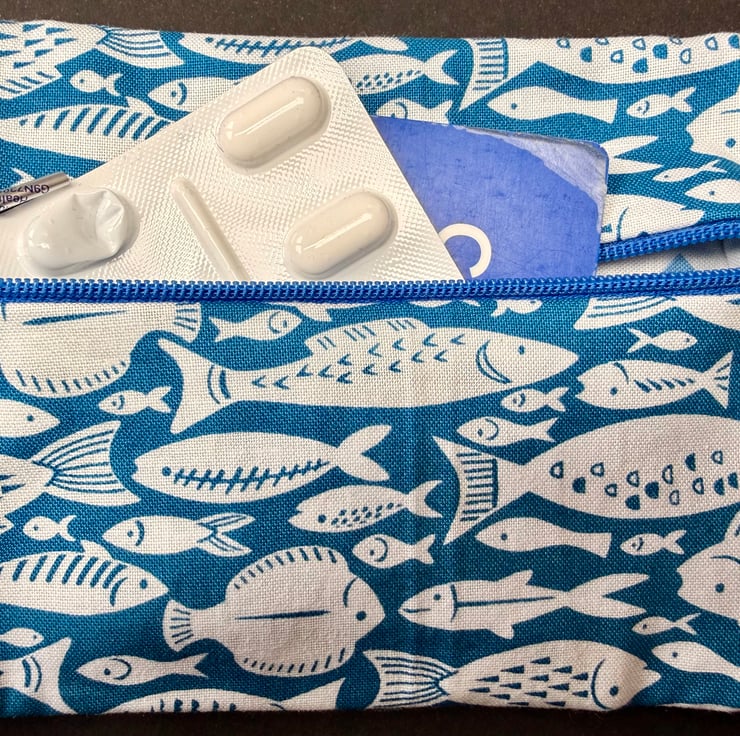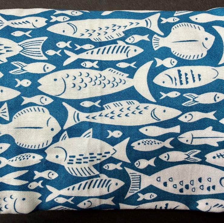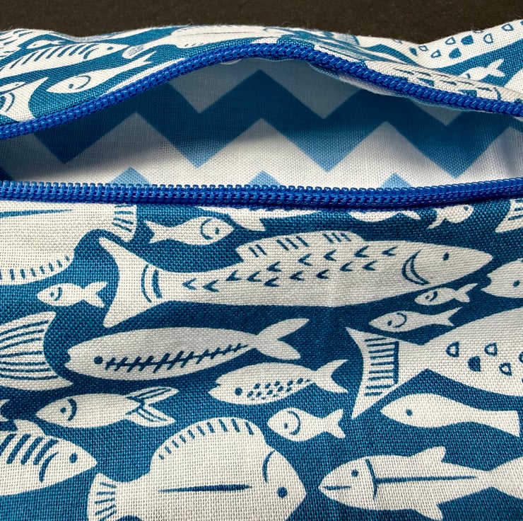 This purse began with the fish fabric which felt bright and full of gentle seaside charm. The mix of white and blue accents against the mid blue background created a calm coastal mood. The zigzag lining was chosen to echo the movement of water and the matching blue zip keeps the design clean and cohesive. The enclosed seams give the purse a tidy finish and a reassuring sense of durability making it a cheerful everyday companion.